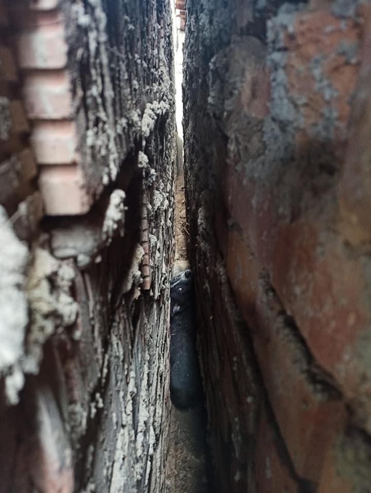 Alături de proprietar, cățelușii și-au reluat joaca, teferi și nevătămați! Nișa dintre două ziduri