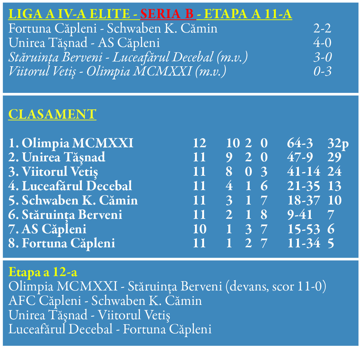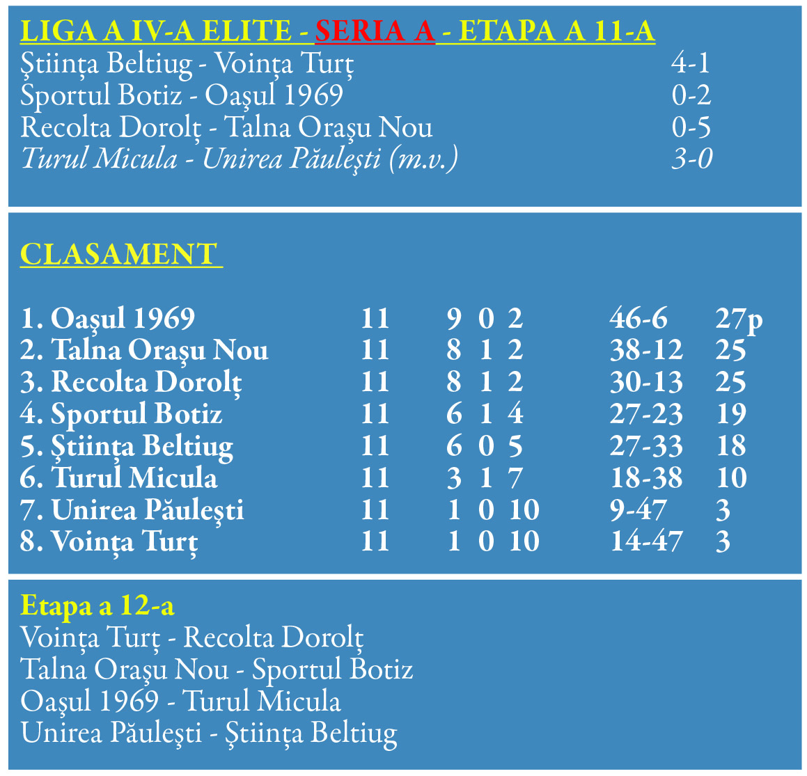 Sezonul de primăvară din Liga a 4-a elite și-a consemnat în week end partidele etapei a 11-a. Iar prima etapă din 2023 a adus în seria A și prima mare surpriză și totodată schimbarea de lider.