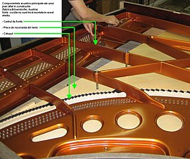 Elementele esențiale pentru producerea sunetului într-un pian sunt: coardele metalice (1) lovite de ciocănelul din lemn cu cap de pâslă (2), călușul (3) pe care sunt fixate coardele prin intermediul unor șiruri de cuie metalice, și care transmite vibrația coardei către placa de rezonanță din lemn (4), care are rolul de a transforma vibrația coardei în unde sonore. Coarda singură produce un sunet aproape inaudibil, datorită suprafeței sale foarte mici, iar placa de rezonanță, care are o suprafață considerabil mai mare, transformă vibrația coardei mult mai eficient în sunet, punând în mișcare un volum mare de aer (vezi și imaginea alăturată).