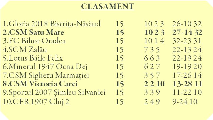 După succesul de sâmbătă 4 martie din restanța de la Cluj Napoca cu Minerul Ocna Dej, Victoria Carei joacă acasă un adevărat derby al salvării de la retrogradare cu Sportul Șimleu.