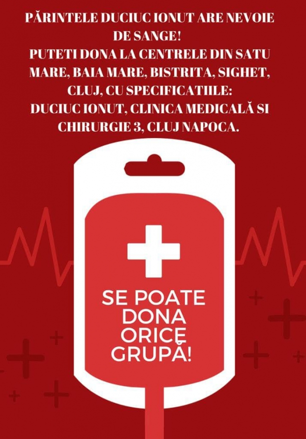 ‼️Are nevoie urgentă de sânge! Sunt rugați să doneze doar cei care sunt nefumători, neconsumatori de alcool și cu o alimentație sănătoasă !!