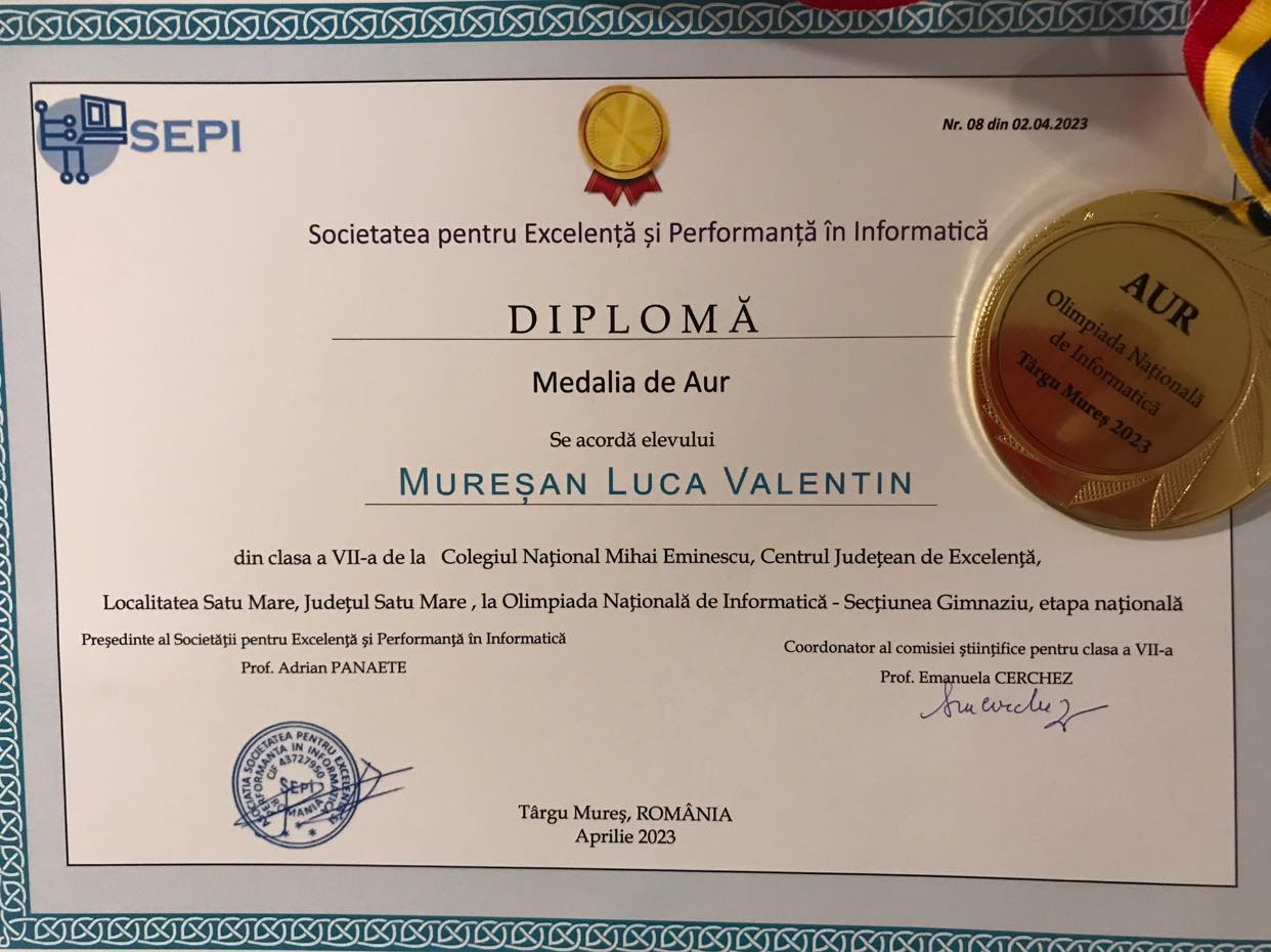 În acest an, Luca Mureșan, elev în clasa a VII-a la Colegiul Național „Mihai Eminescu” din Satu Mare, a participat în perioada 1-5 aprilie la etapa națională a Olimpiadei Naționale de Informatică 2023, desfășurată la Târgu Mureș, unde a fost medaliat cu aur.