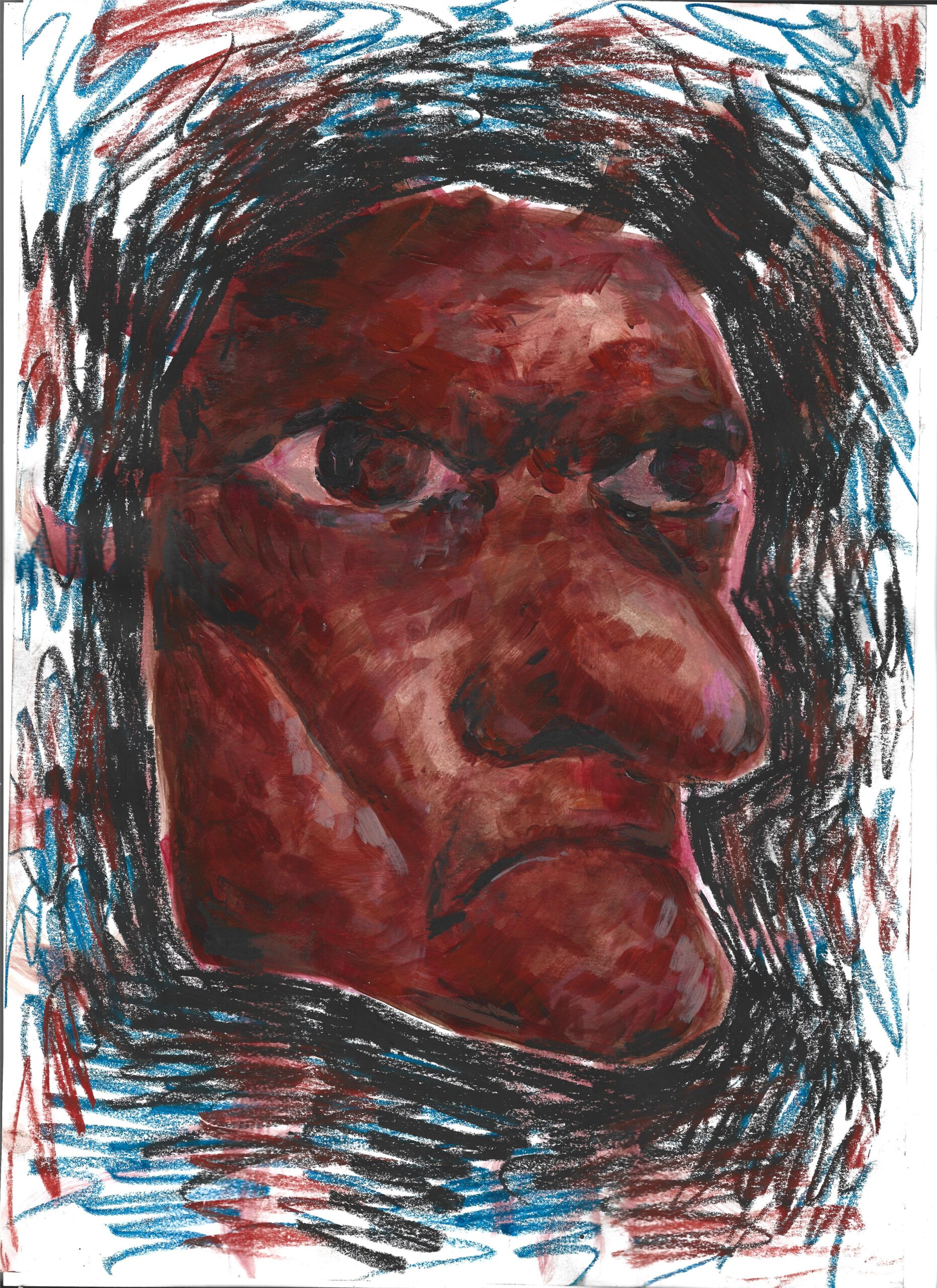 (Titlul lucrării: ,,Adevărata față a societății din spatele măștilor,, - desen pe foaie A4 realizat în acrilic și pastel-uri cerate. Maria Tămaș - clasa a VII a B - elevă la Școala Gimnazială ,,Mircea Eliade,, - Satu Mare)
