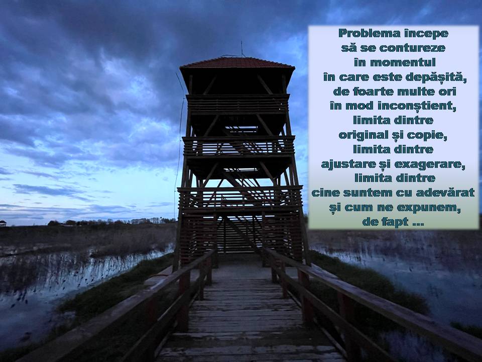Omul, ca și ființă supremă, nu va fi niciodată mulțumit de ceea ce poate realiza, însemna și deține. Această lipsă a limitelor și a cumpătării este avantajoasă și distructivă deopotrivă. Ne chinuim să impresionăm cele mai nepotrivite persoane, în cele mai nepotrivite moduri și situații. De ce? Pentru că, întotdeauna, aprecierea primită pentru ceea ce suntem cu adevărat, va decădea în favoarea atenției generate de ceva spontan, temporar și atipic. Ignorăm oamenii și întâmplările care ne hrănesc fericirea și ne mențin statornicia și compromitem tot ce oferă sens și culoare vieții noastre, lăsându-ne mult prea duși de val.