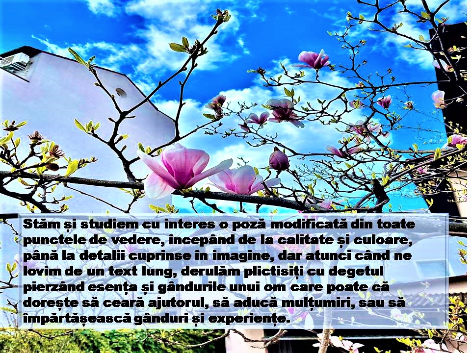 O poză făcută în 30 de secunde și editată în trei minute, adună mai multe reacții decât un text lucrat cu atenție, plin de mesaje și de detalii despre omul din spatele acelor cuvinte. Socializarea nu înseamnă doar vizualizare. Socializarea înseamnă interes, apreciere și reacție, pentru că numai așa un mesaj poate să ajungă la oamenii cărora le-a fost destinat.