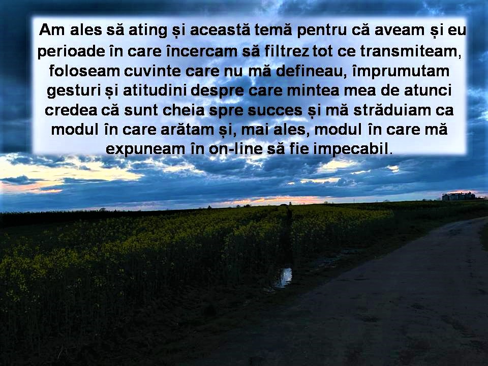 Invit pe această cale toți cititorii care sunt în asentimentul meu și consideră că viața fără filtre e mult mai colorată și vibrantă decât ne-am putea imagina, să posteze o fotografie în care să predomine însemnătatea mai mult decât calitatea. O fotografie sugestivă pentru ei, indiferent dacă e vorba de un selfie, un peisaj, un fel de mâncare preferat sau un animal de companie.