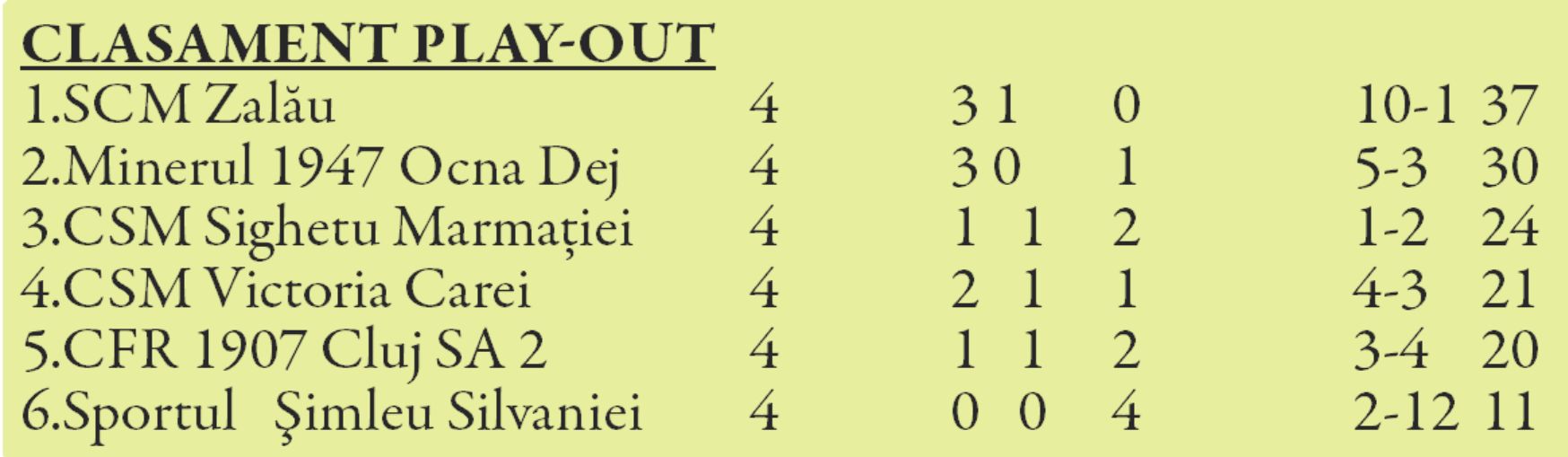 Tot în etapa a 5-a a play out-ului se mai joacă CFR II Cluj- Minerul Ocna Dej și CSM Sighet- Sportul Șimleu.