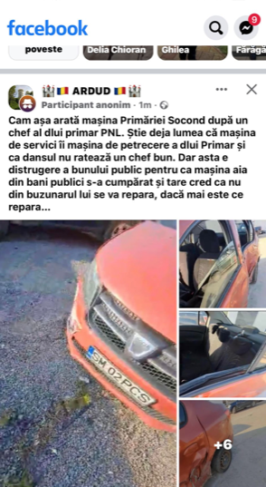 „Cam așa arată mașina Primărie Socond după un chef al dlui primar PNL.Știe deja lumea că mașina de servici îi mașina de petrecere a dlui Primar și că dânsul nu ratează un chef bun.Dar aste e distrugere a bunului public pentru că mașina aia din bani publici s-a cumpărat și tare cred că nu din buzunarul lui se va repara,dacă mai este ce repara…”