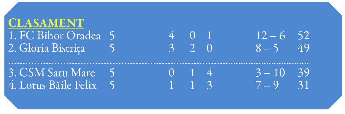 În clasamentul seriei a 10-a CSM Olimpia ocupă locul 3 la opt puncte în fața celor de la Lotus. Dar și o diferență de 10 puncte în spatele locului doi, ocupat de Gloria Bistrița-Năsăud, echipă ce joacă miercuri la Oradea cu FC Bihor și apoi va veni sâmbătă la Satu Mare...
