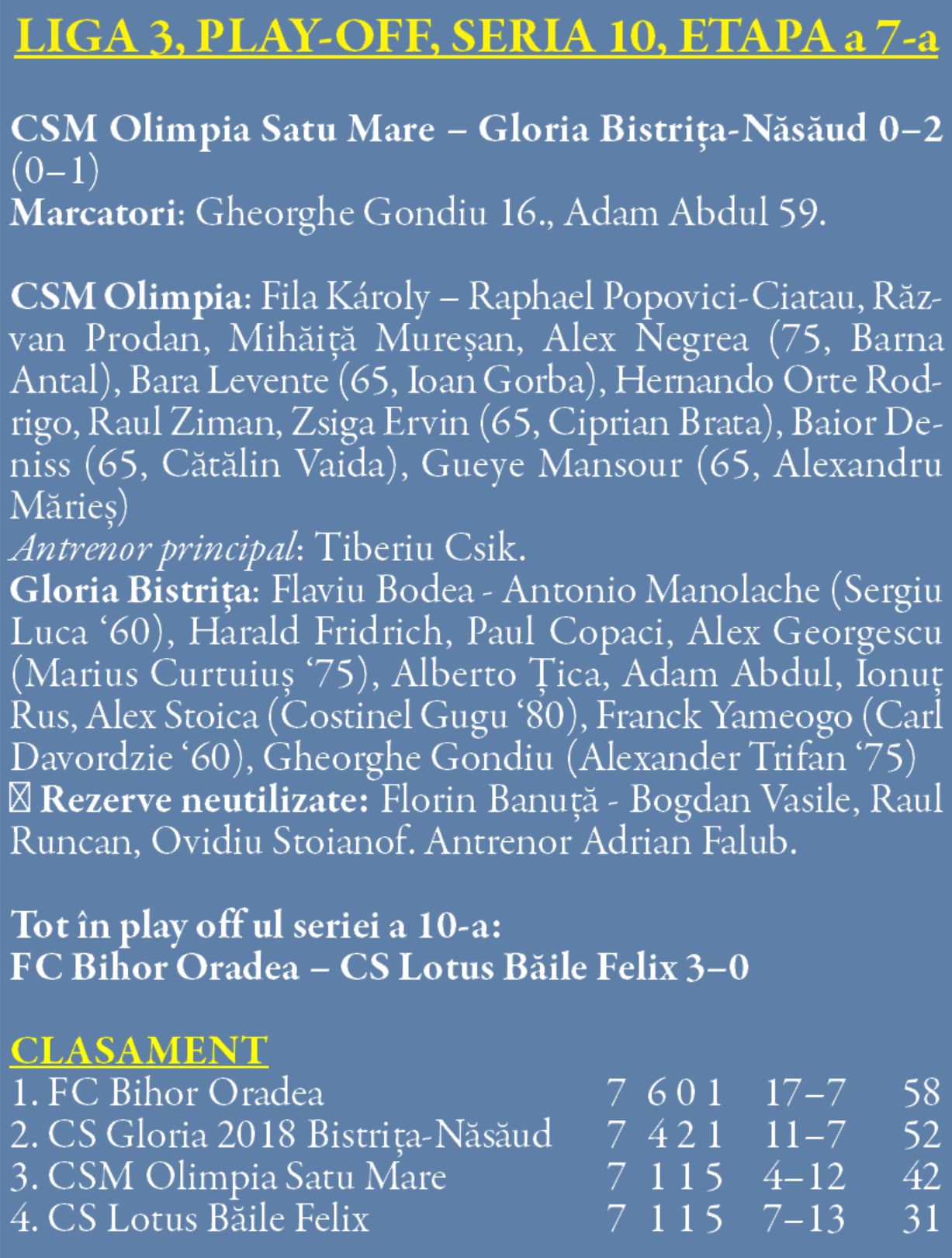 După o evoluție ștearsă, echipa de fotbal din cadrul Clubului Sportiv Municipal Olimpia Satu Mare a suferit a cincea înfrângere în play-off-ul ligii a 3-a, 0-2 cu Gloria Bistrița.