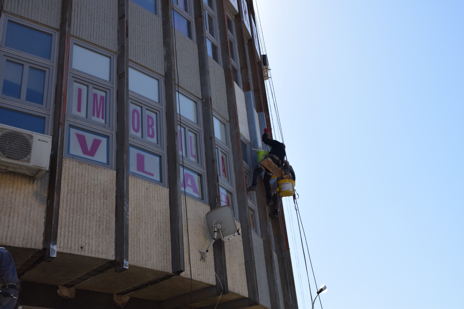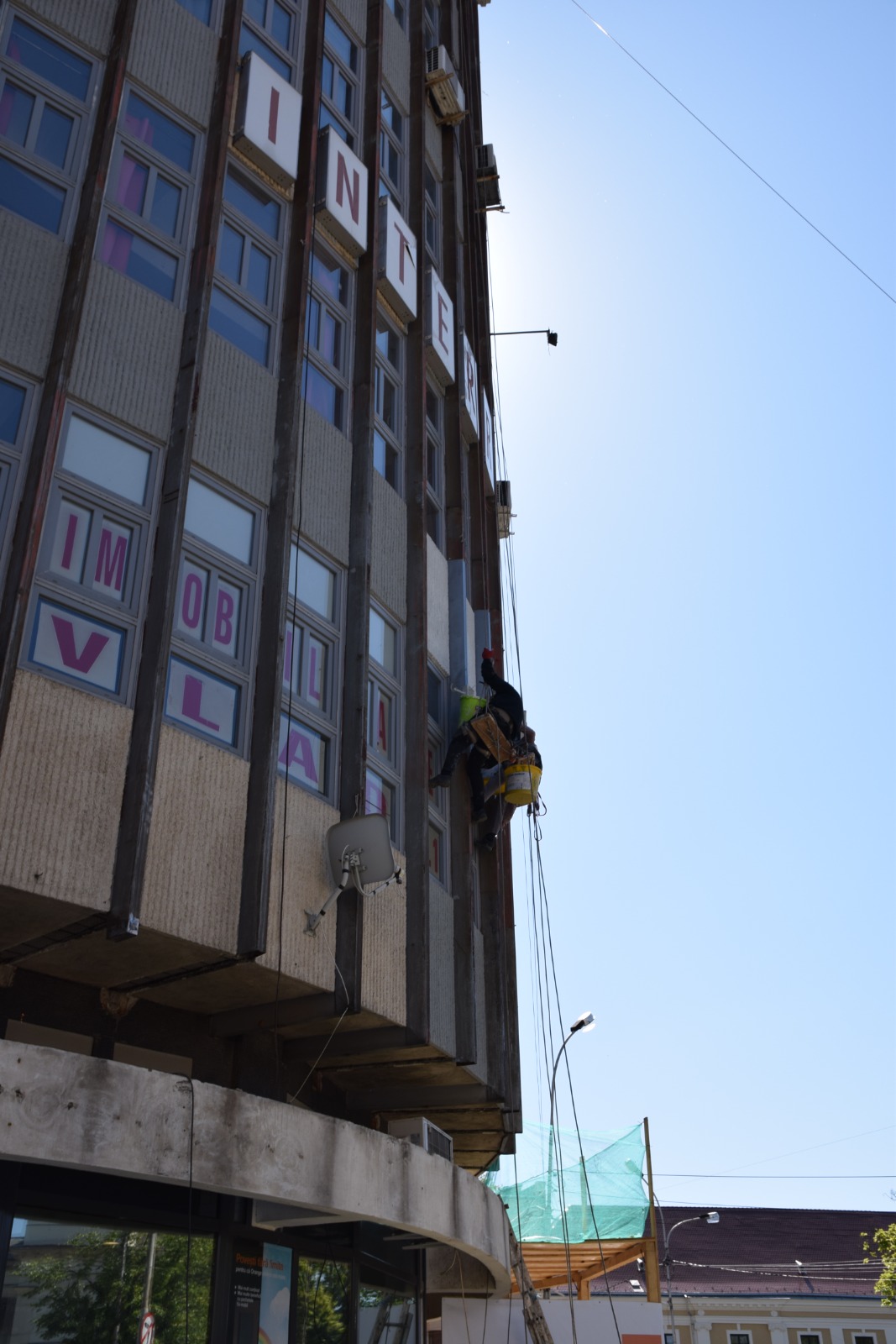 Imaginea zilei ne-a fost oferită de meseriașii care joi încercau să înfrumusețeze ( dacă se poate așa ceva) fațada Casei de Modă...Nu puțini au fost sătmărenii care s-au întrebat cum de a fost posibilă plantarea unui astfel de butoiaș în zona centrului vechi...Mai ales că arhitectural vorbind Casa se lipește ca nuca de perete cu ce e prin preajmă...Au tot apărut soluții de încadrare în decor de genul...”îmbrăcați-o în sticlă” sau măcar ”dați-i o culoare”...Ei bine, primele semne au apărut în această primăvară...Să vedem dacă oamenii păianjen vor continua munca sau se vor opri doar la ”birourile închiriate de o anumită firmă”...S-avem un week end liniștit și călduros!