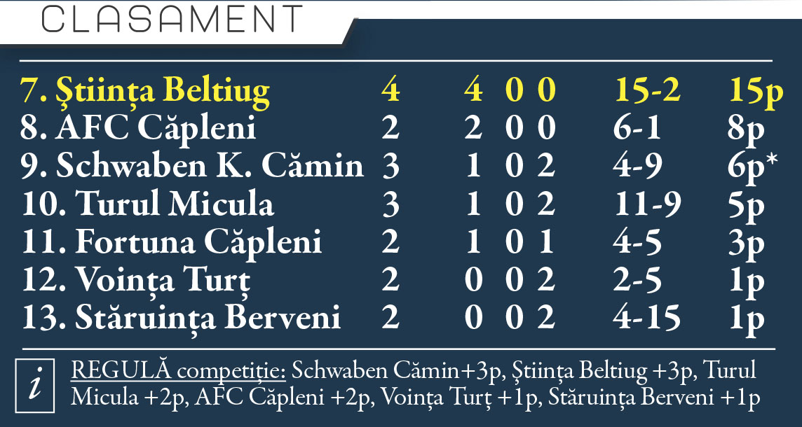 Turul Micula - Voinţa Turţ, amânat. Stăruinţa Berveni - Fortuna Căpleni, amânat. Schwaben K. Cămin stă