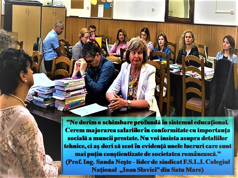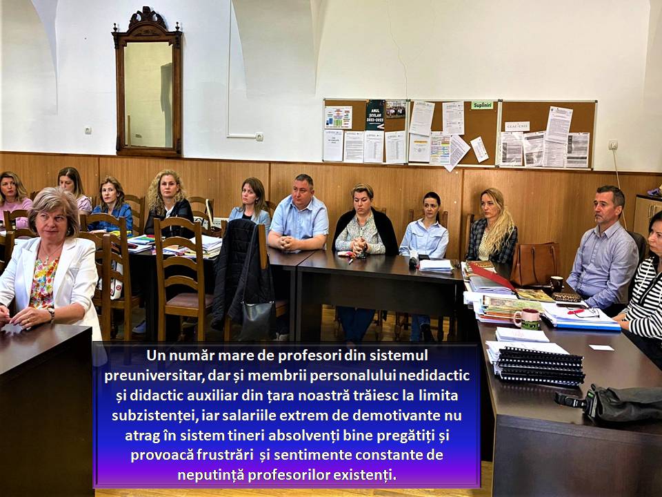 Profesia aceasta nu este atractivă pentru tineri, oricât ar fi de pasionați, având în vedere condițiile de muncă, dar mai ales salariile atât de mici. Nici contextul social nu ne ajută în profesia noastră. Mediul social, social-media, nu oferă modele pozitive, nu mai avem o scară a valorilor în Romania în acest moment. Uneori, nici familiile nu își aduc prea mult o contribuție pozitivă. Statutul profesorului trebuie reabilitat din toate punctele de vedere. Creșterea salariilor profesorilor ar mobiliza nu doar pe cei din sistem, ci ar aduce în viitor tineri bine pregătiți la catedră. Ar crește cu siguranță și calitatea învățământului care s-ar traduce, în timp, în copii și viitori adulți educați. Este primul pas, cel mai important, către o Românie prosperă, pe care cu toții ne-o dorim.”