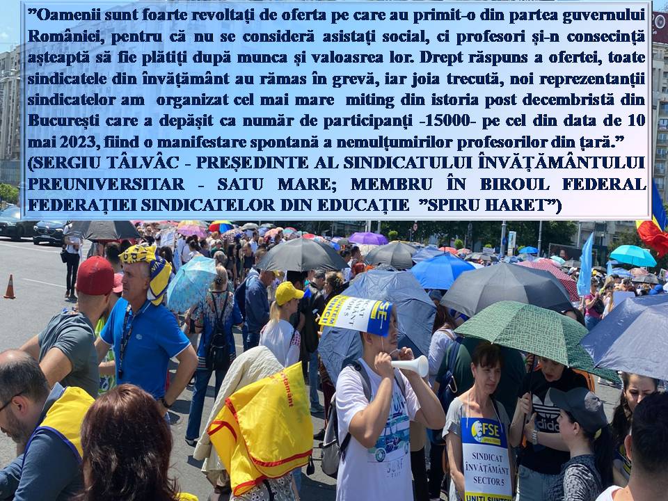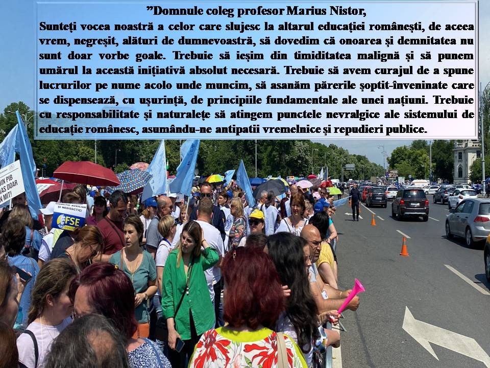 Mă bucur că fac parte dintr-o categorie profesională majoritar unită și că am posibilitatea să-mi strig (măcar atât), cu demnitate și-n unire cu alți colegi, nemulțumirile pe care împreună le-am strâns de foarte mulți ani încoace. Sper ca aceste cuvinte să declanșeze vremuri de trezire, în care să vedem că ”A EXPLODAT MĂMĂLIGA”, parafrazând o expresie lansată în timpul Revoluției din ’89 din balconul Operei Române de Ioan Chiș (cfr. https://malinbot.wordpress.com/). Dragi guvernanți și parlamentari ... fiți atenți la strigătul celor care au tăcut și înghițit timp de peste 33 de ani umilințe și dispreț, fiind călcați în picioare repetat și fără scrupule de foști elevi ajunși cu multe drepturi, dar fără obligații. Fără ei, România nu ar fi creeat un Mihai Eminescu, un George Enescu, un Brâncuși, etc. Fără ei, dumneavoastră nu ați fi ajuns oameni mari, în stare să citiți și să dezbateți legi, să vă calculați salariile, indemnizațiile și pensiile speciale. Redați-ne demnitatea în societate. Dar nu prin voucere sau prin ”bănuți de acadele” ... ci prin recunoașterea la justa valoare a ceea ce suntem, dascăli și formatori de viitor. Până nu-i prea târziu.Cu respect.