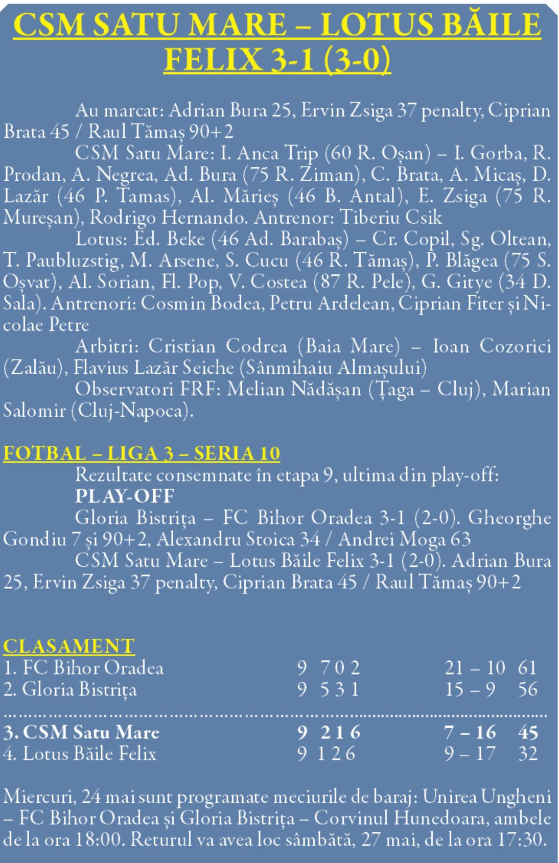 CSM Olimpia a terminat campionatul pe locul 3 al seriei a 10-a în vreme ce FC Bihor și Gloria Bistrița merg la barajul de promovare în Liga a 2-a.