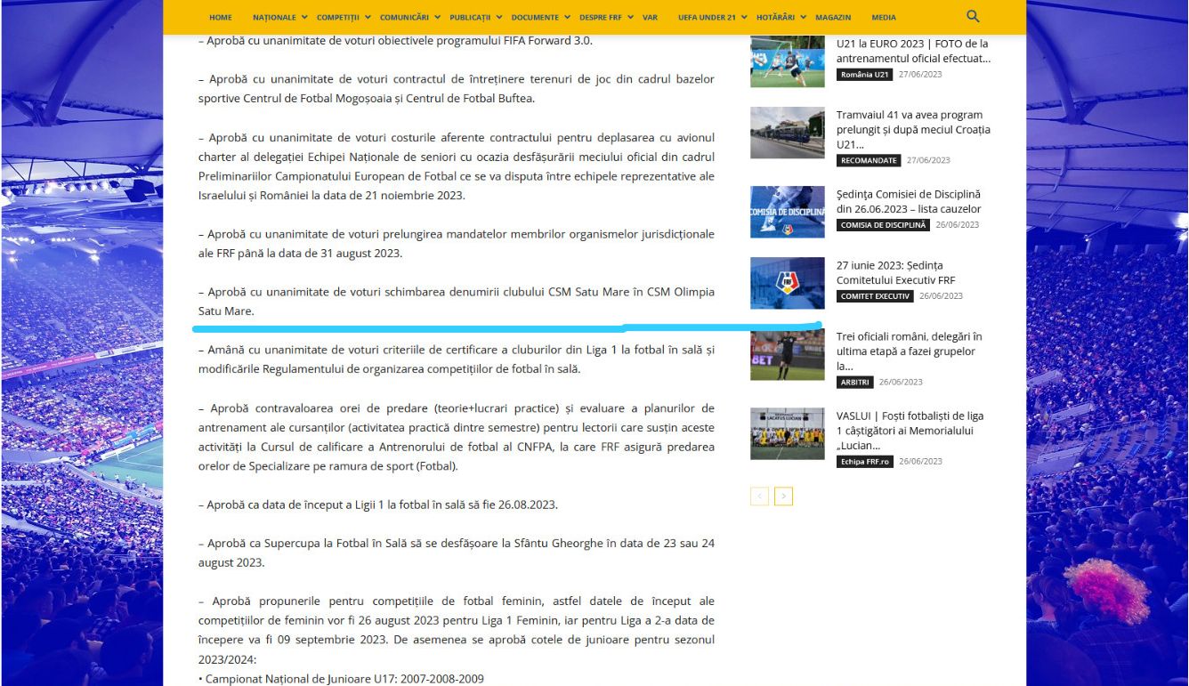 ”– Aprobă cu unanimitate de voturi schimbarea denumirii clubului CSM Satu Mare în CSM Olimpia Satu Mare.” Se anunță în cominicatul postat pe pagina frf.ro.
