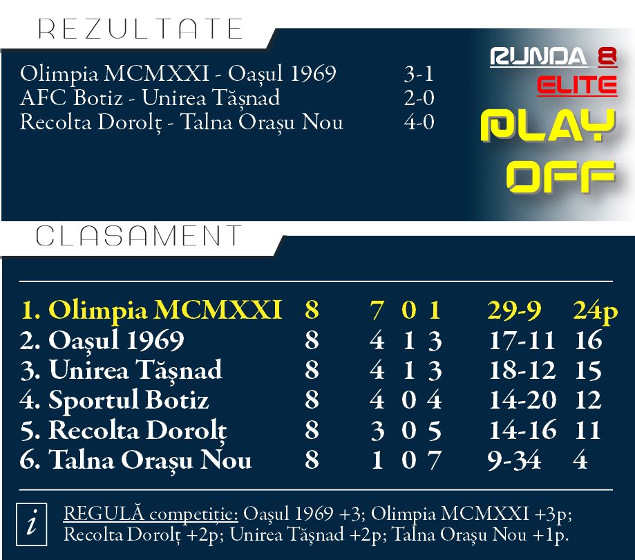 Olimpia Satu Mare e noua campioană a județului Satu Mare. Galben-albaștrii antrenați de Cristi Popa și Ovidiu Suciu s-au impus miercuri după amiază în derby-ul cu Oașul Negrești Oaș, scor 3-1, și matematic și-au asigurat prezența la barajul de promovare în liga a 3-a, cu două etape înaintea finalului din play-off-ul Ligii a 4-a elite.