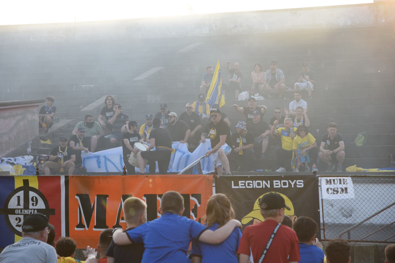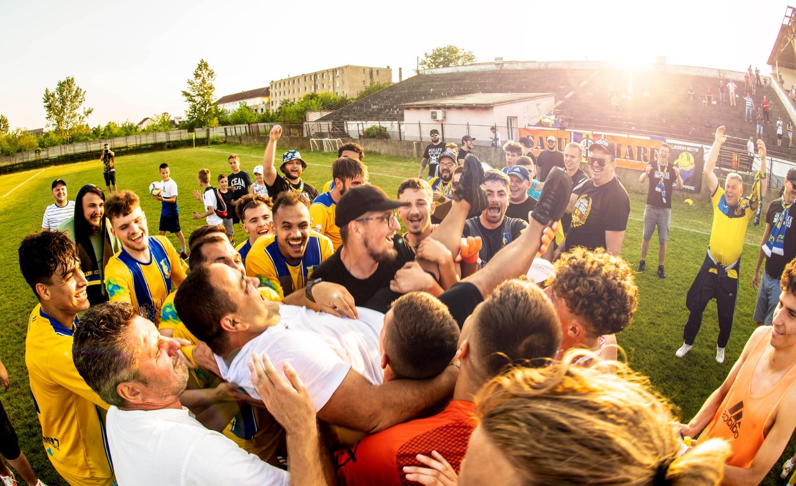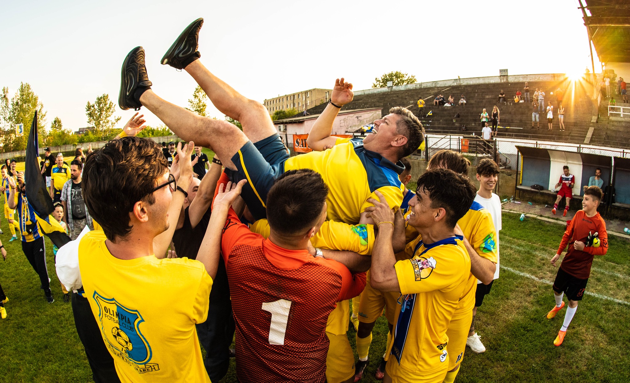 Antrenorii Cristi Popa și Ovidiu n-au scăpat de tradiționala ”aruncare pe brațe” iar galeria a coborât în iarbă pentru a sărbători împreună cu jucătorii.