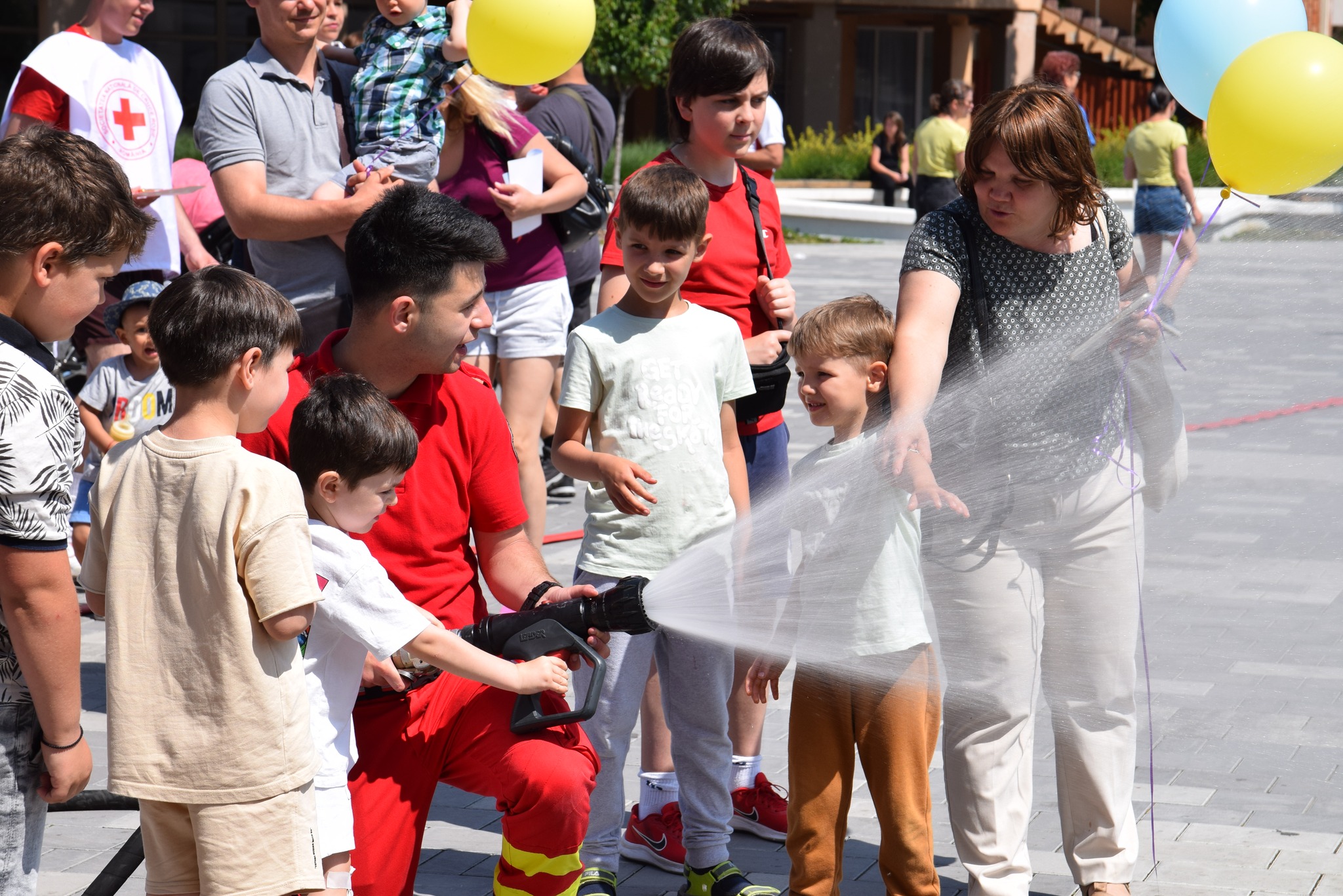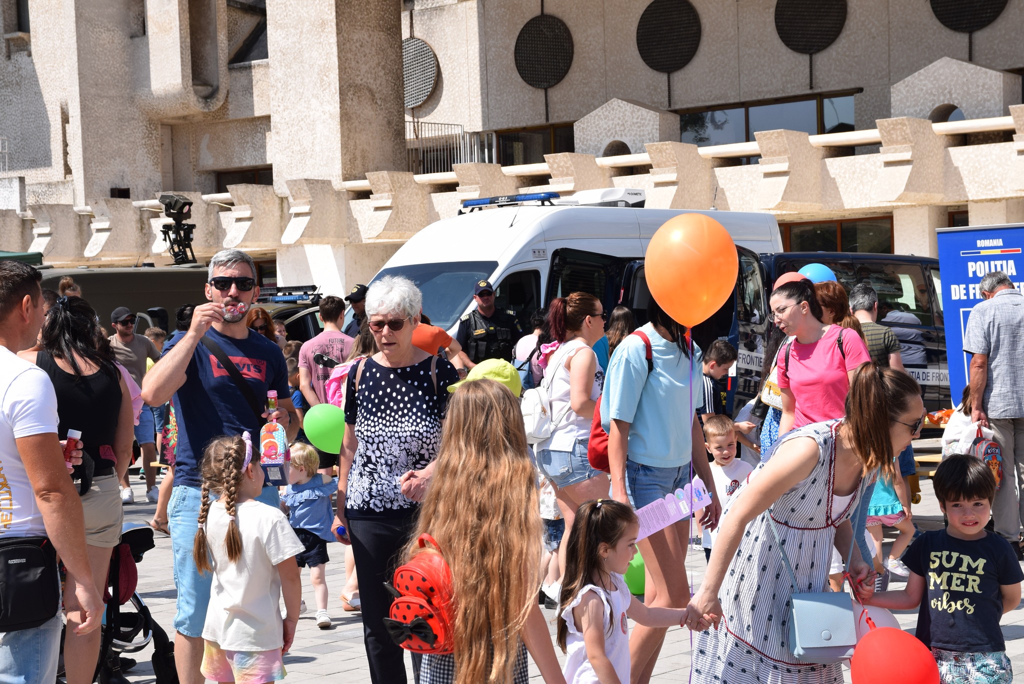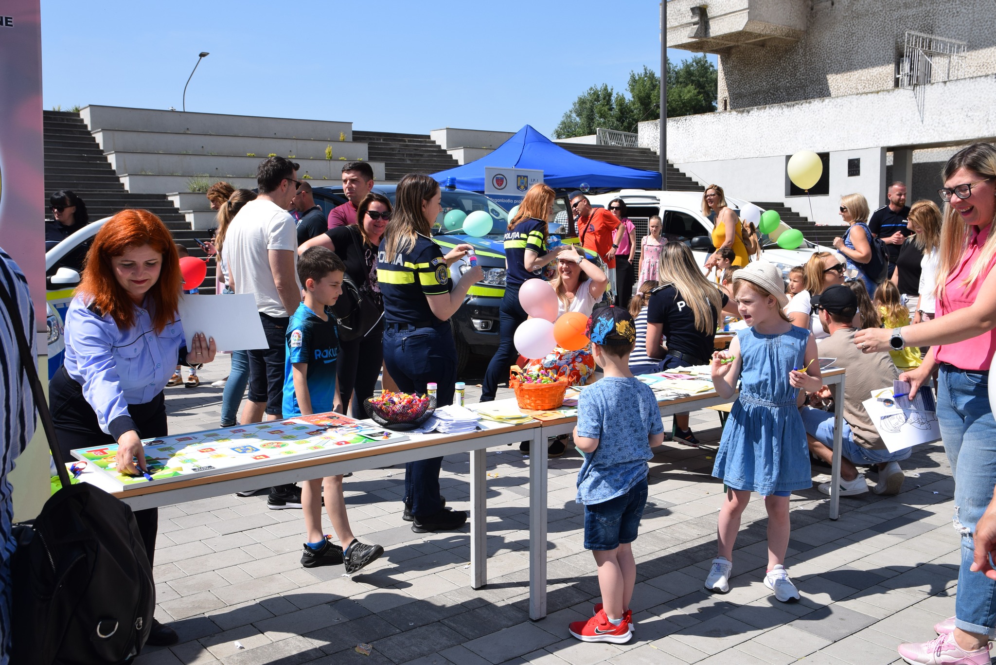 Sutele de copii prezenți au desenat pe asfalt, au primit de asemenea și planșe de colorat, s-au îmbrăcat în ținutele Structurilor MAI, s-au jucat cu baloane colorate și din săpun și au testat mașinile din dotare.