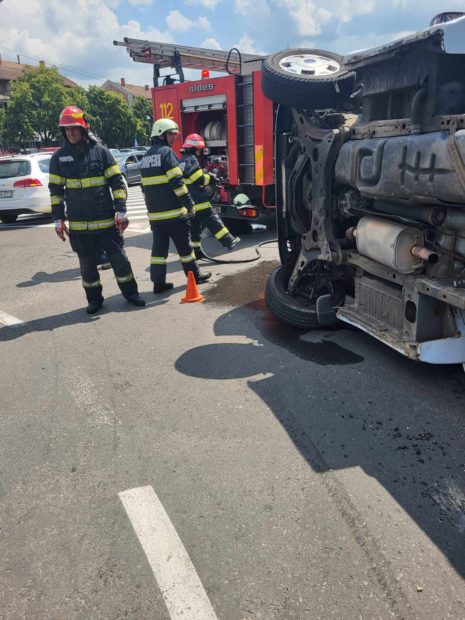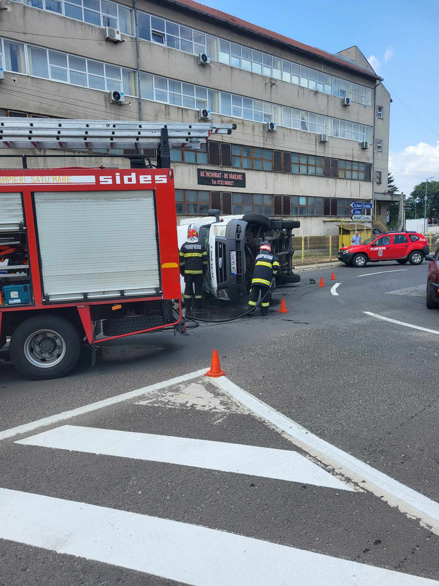Accident în municipiul Satu Mare. Un șofer s-a răsturnat cu autoutilitara pe bulevardul Lucian Blaga.