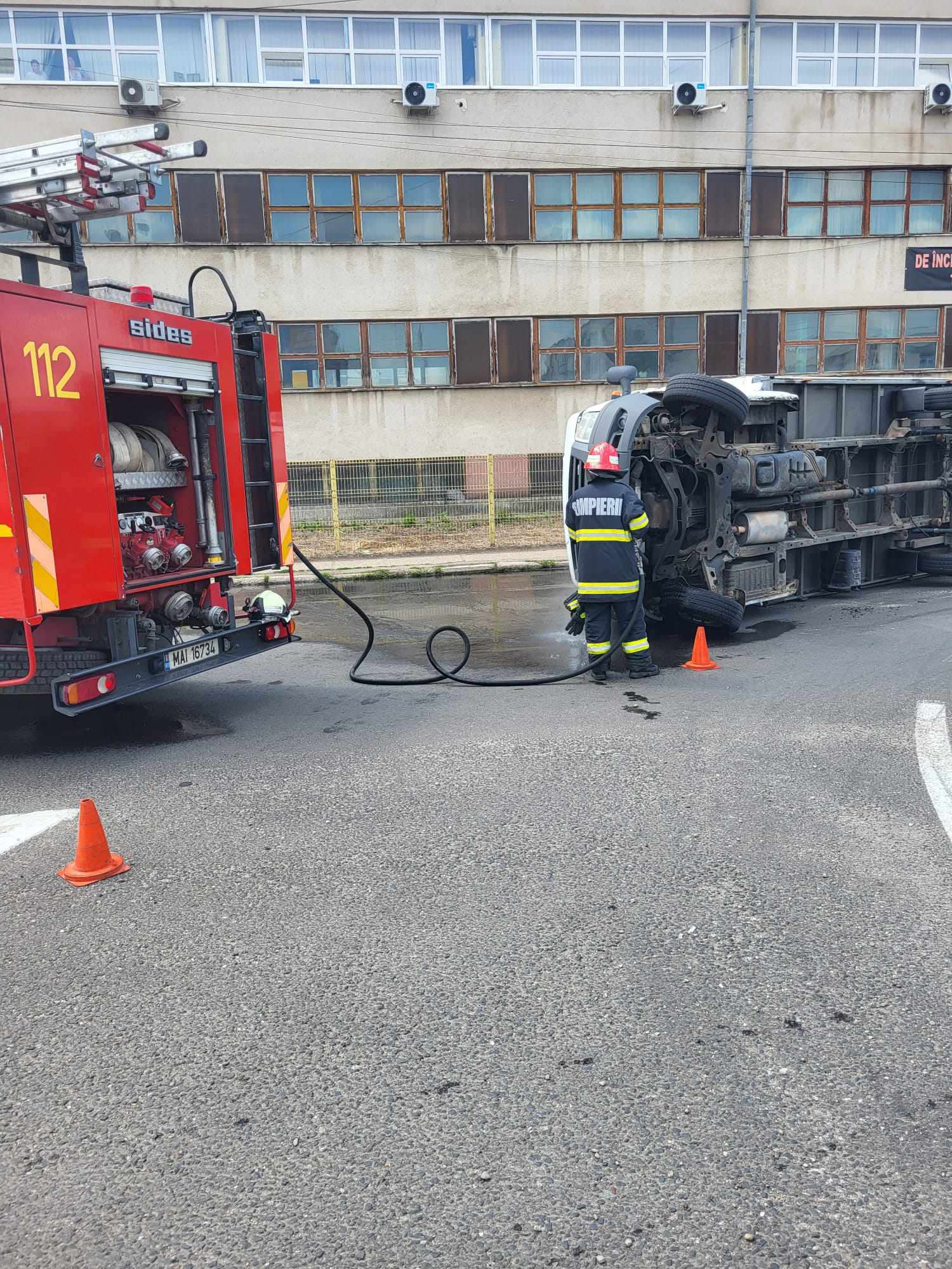 ”Mașină răsturnată in municipiul Satu Mare, bulevardul Lucian Blaga. Există scurgeri de combustibil. La fața locului s-au deplasat două autospeciale, un TIM si 10 subofițeri din cadrul Detașamentului Satu Mare”, informează ISU Satu Mare.