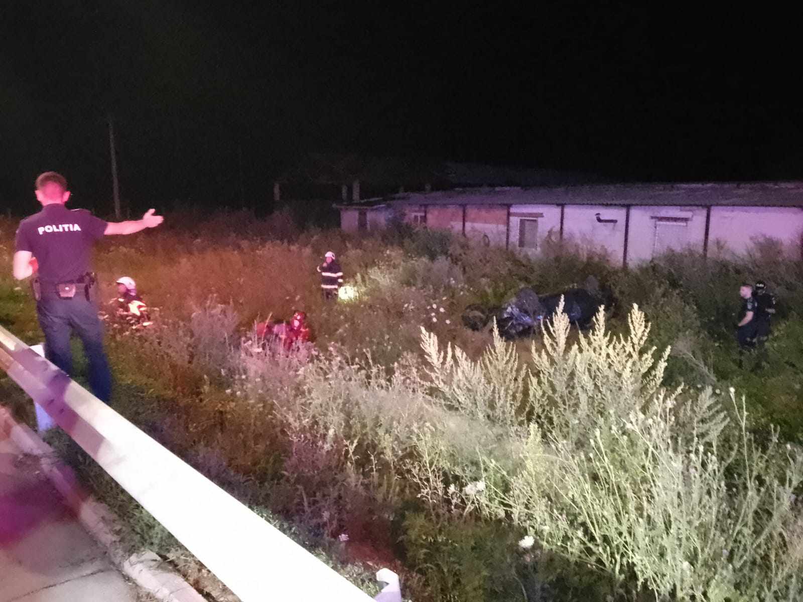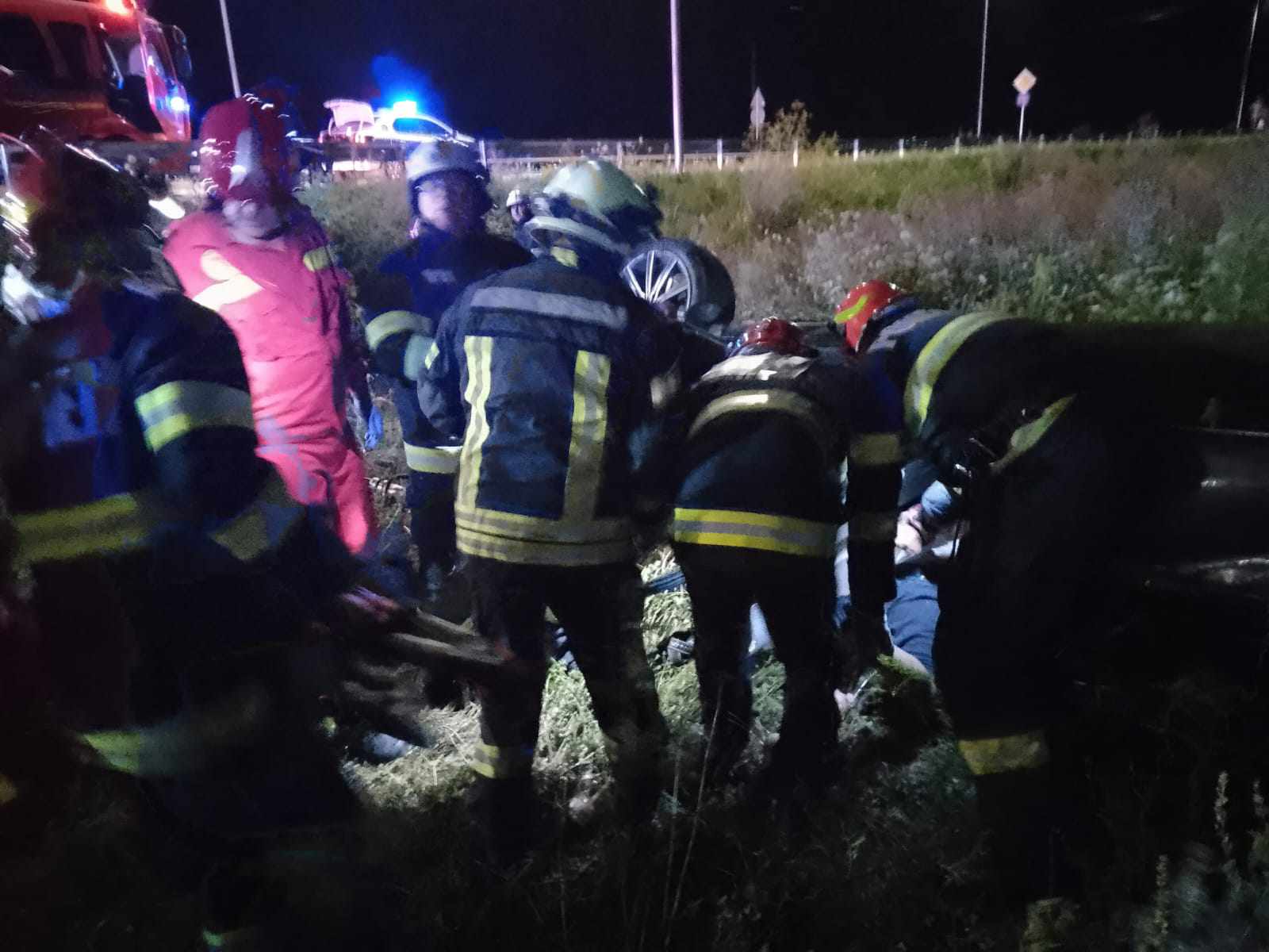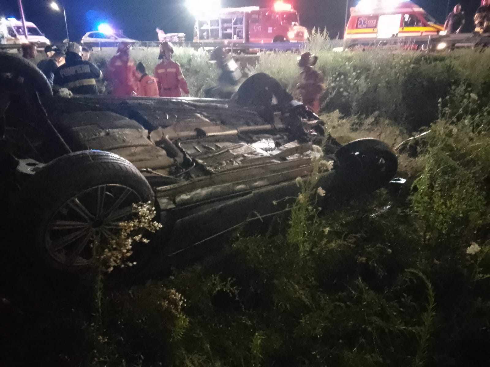 Pentru misiune a fost alocat și un echipaj al Serviciului de Ambulanță Județean. La fața locului, echipajele operative au constatat faptul că un autoturism în care se aflau două persoane, a ieșit în afara părții carosabile și s-a răsturnat pe plafon.