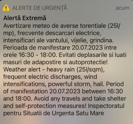 ALERTĂ. Avertizare meteo de averse torentiale si descarcari electrice Locale • 20.07.2023 00:00 | Distribuie: Primește ziarul gratuit pe email! Abonează-te și citești ziarul Gazeta Nord-Vest zilnic, gratuit. Abonează-te Acasa Locale ALERTĂ. Avertizare meteo de averse torentiale si d... Articole Similare Locale Complexul de Educație Ecologică „Casa verde” din Grădina Romei, a fost gazda festivității de lansare a unui nou proiect de mediu cu titlul: GRĂDINIȚE SALVATOARE DE RÂURI acum 13 ore Locale Viceprimarul Cristina Tămășan Ilieș felicită Poliția Locală. Acțiuni intensificate împotriva cerșetoriei în Satu Mare acum 13 ore Locale Peste 10.000 de cărți electronice de identitate emise în Satu Mare. Viceprimarul Raul Băbțan: „Digitalizarea devine realitate” acum 13 ore Locale Deputatul Mircea Govor: Bugetul României a fost adoptat. Investiții importante pentru județul Satu Mare acum 13 ore Locale Cea mai mare creșă din Satu Mare, aproape de finalizare: 110 locuri pentru copii acum 14 ore Locale Deratizare în Satu Mare, în perioada 23–27 martie 2026. Avertisment pentru populație acum 14 ore Ultimele Articole Locale APASERV. Grupa Albinuțelor de la Grădinița 14 Mai a descoperit drumul apei acum 15 ore Locale Activități dedicate Zilei Mondiale a Apei. Concurs de desen, experimente și lecții despre natură pentru elevii din Medieșu Aurit acum 18 ore Locale Campania APIA 2026 – clarificări privind eliberarea adeverințelor necesare fermierilor pentru obținerea subvențiilor acum 18 ore Locale Acțiune de amploare a polițiștilor în Ardud și Beltiug: amenzi de peste 57.000 de lei și lemn confiscat acum 18 ore Locale Împreună hrănim speranța: Federația Băncilor pentru Alimente dă startul celei de-a 14-a ediții a Colectei Naționale de Alimente în Lidl, PENNY, Auchan, Kaufland și Profi acum 19 ore Locale „Maratonul poveștilor”, la Biblioteca Județeană Satu Mare, de Ziua Internațională a Cărții pentru Copii și Tineret acum 20 ore Cele mai citite 1 Complexul de Educație Ecologică „Casa verde” din Grădina Romei, a fost gazda festivității de lansare a unui nou proiect de mediu cu titlul: GRĂDINIȚE SALVATOARE DE RÂURI 2 NORD VEST TV. Slăbitul cu injecții, între speranță și risc. Avertismentul unui medic gastroenterolog din Satu Mare 3 Viceprimarul Cristina Tămășan Ilieș felicită Poliția Locală. Acțiuni intensificate împotriva cerșetoriei în Satu Mare 4 Cea mai mare creșă din Satu Mare, aproape de finalizare: 110 locuri pentru copii 5 APASERV. Grupa Albinuțelor de la Grădinița 14 Mai a descoperit drumul apei Din aceeasi categorie Complexul de Educație Ecologică „Casa verde” din Grădina Romei, a fost gazda festivității de lansare a unui nou proiect de mediu cu titlul: GRĂDINIȚE SALVATOARE DE RÂURI acum 13 ore Viceprimarul Cristina Tămășan Ilieș felicită Poliția Locală. Acțiuni intensificate împotriva cerșetoriei în Satu Mare acum 13 ore Peste 10.000 de cărți electronice de identitate emise în Satu Mare. Viceprimarul Raul Băbțan: „Digitalizarea devine realitate” acum 13 ore Deputatul Mircea Govor: Bugetul României a fost adoptat. Investiții importante pentru județul Satu Mare acum 13 ore Cea mai mare creșă din Satu Mare, aproape de finalizare: 110 locuri pentru copii acum 14 ore Ultimele stiri Complexul de Educație Ecologică „Casa verde” din Grădina Romei, a fost gazda festivității de lansare a unui nou proiect de mediu cu titlul: GRĂDINIȚE SALVATOARE DE RÂURI acum 13 ore Viceprimarul Cristina Tămășan Ilieș felicită Poliția Locală. Acțiuni intensificate împotriva cerșetoriei în Satu Mare acum 13 ore Peste 10.000 de cărți electronice de identitate emise în Satu Mare. Viceprimarul Raul Băbțan: „Digitalizarea devine realitate” acum 13 ore Deputatul Mircea Govor: Bugetul României a fost adoptat. Investiții importante pentru județul Satu Mare acum 13 ore Cea mai mare creșă din Satu Mare, aproape de finalizare: 110 locuri pentru copii acum 14 ore