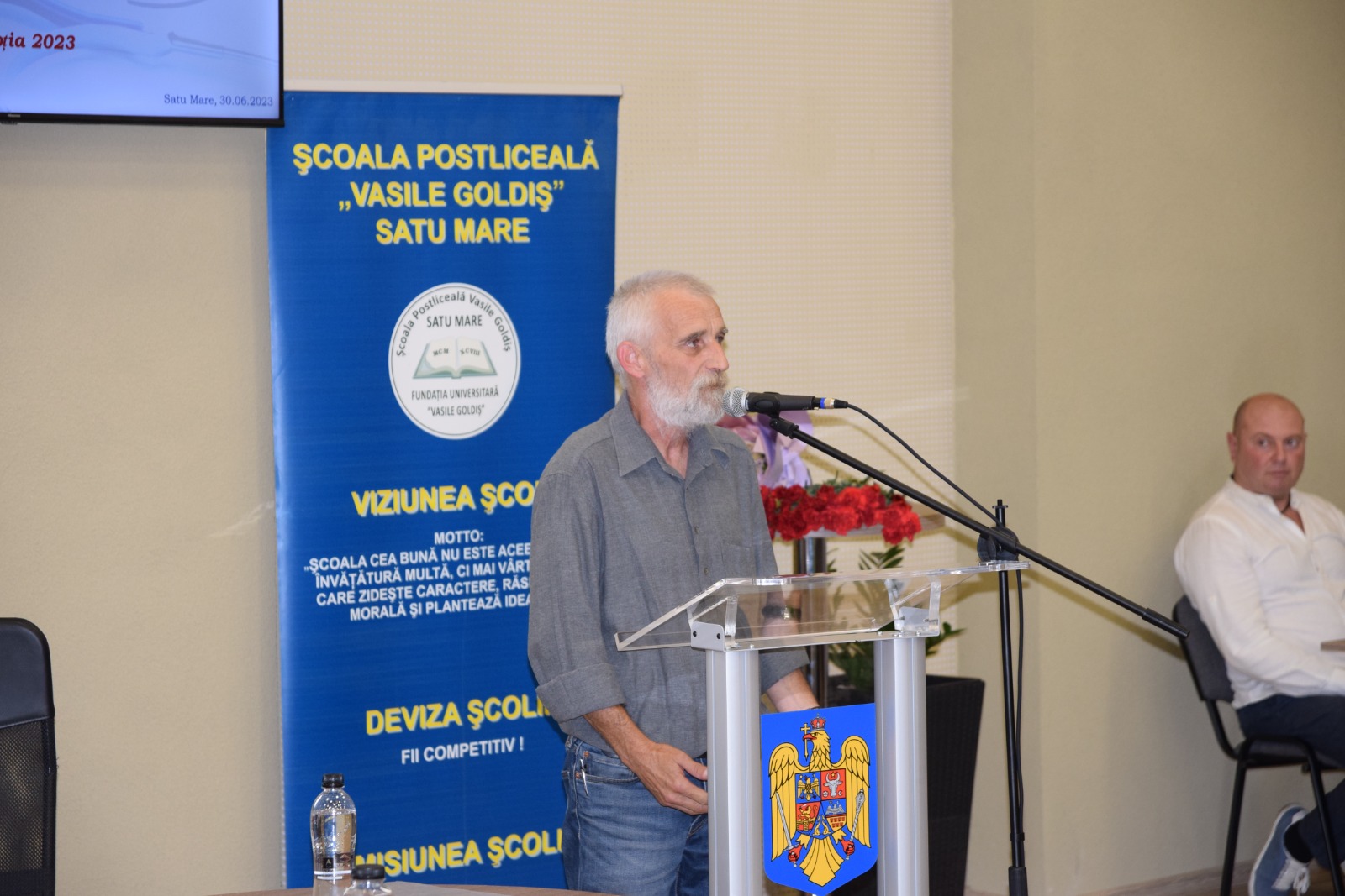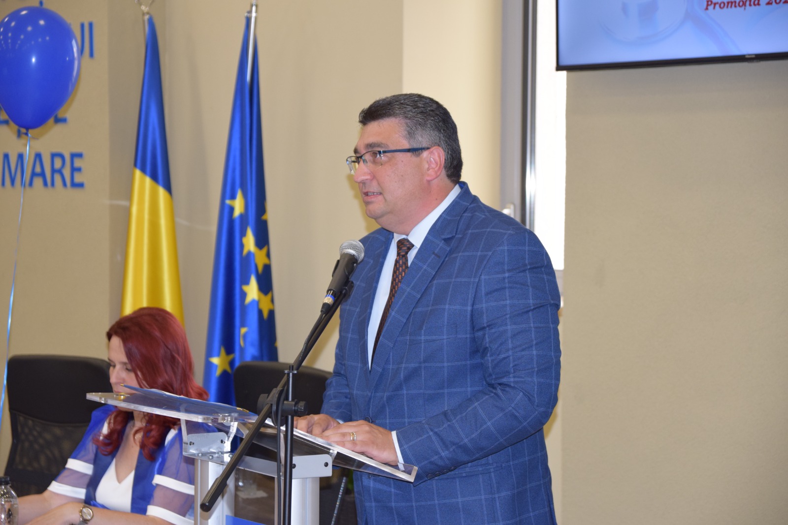 „Ne aflăm în fața unui moment deosebit în care o nouă promoție de absolvenți ai Școlii Postliceale „Vasile Goldiș” din Satu Mare serbează în acest cadrul festiv finalizarea studiilor. Desigur, această festivitate reprezintă o adevărată sărbătoare pentru voi, dragi absolvenți, pentru cadrele didactice pentru familiile dumneavoastră, dar este și un moment de reflexție asupra anilor minunați petrecuți împreună, dar mai ales asupra a ceea ce vom face în viitor. Vreau să încep prin a vă spune că voi sunteți o promoție specială deoarece sunteți promoția care a debutat cu anul întâi în 2020, în plină pandemie de coronavirus, cu care din punct de vedere al practicii, ar trebui să ne reorganizăm, să ne reorientăm, dar cred că am reușit și asta sper că se va vedea la examenul de absolvire. Sunteți promoția care în anul doi a fost nu doar martor a evaluării periodice a agenției române de asigurare a calității învățământului universitar, în urma căruia școala noastră și-a menținut acreditarea. Ci ați fost atractivi și inspirati ai realizarilor recente cu care ne mândrim. Vă mulțumesc încă odată pentru faptul că ne-ați ales pe noi să vă fim alături în acești ani și nu uitați că porțile școlii noastre vă vor fi mereu deschise. Fiind un moment festiv, îmi permit să vă suferez câteva direcții care poate le veți lua în considerare pe viitor. Dacă aș fi în locul dumneavoastră, nu aș înceta să visez, nimic nu este imposibil cu condiția să vrei. Astăzi practic se deschide un nou capitol în viața voastră, cum îl scrieți acest capitol, depinde în mare măsură de voi. Folosiți-vă cunoștințele dobândite pe parcursul celor trei ani în școală și de aptitudinile cu care va înzestrat Dumnezeu și transformați-vă visele în realitate. Prin ceea ce veți face în viitor, vă doresc să fiți împliniți, la început vedem într-un anumit fel, suntem idealiști, avem aspirații, dar în timp, după absolvire, suntem tentați să uităm ce vis a fost la început, este important să nu vă uitați visul, să nu uitați de ce ați dprit să deveniți asistenți medicali. Dragi absolvenți, ați învățat de la profesorii voștri foarte multe lucruri din care unul este esențial pentru reușita în profesie, dar și în viață, faptul că numai învățând în continuare, veți putea să asigurați desăvârsirea și succesul. Învățarea continuă este cheia către succes. În domeniul medical, studiul nu se termină niciodată, după cum bine știți, tot timpul apar proceduri medicale noi, echipamente și aparatură npuă care necesită studiu amănunțit. Cercetarea, studiul, vă pot ajuta să vă dezvoltați profesional. Nu uitați că acum aveți la îndemână cel mai mare avantaj, tehnologia. Trăim într-o lume în care aceasta face totul mai accesibil și trebuie să profitați de acest lucru. Un ultim sfat pe care vi-l dau este să puneți mereu pe primul plan familia”, spus directorul conferențiar universitar doctor Lazăr Vasile.