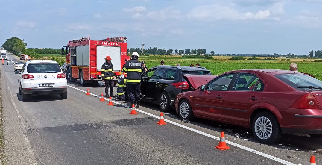 Detașamentul de pompieri Carei intervine cu o autospecială de stingere cu apă și spumă, o ambulanță SMURD tip B2 și echipaje specializate, pentru asigurarea măsurilor PSI, evaluarea persoanelor implicate și acordarea primului ajutor, în urma producerii unui accident rutier, între 3 autoturisme în localitatea Moftinu Mic.