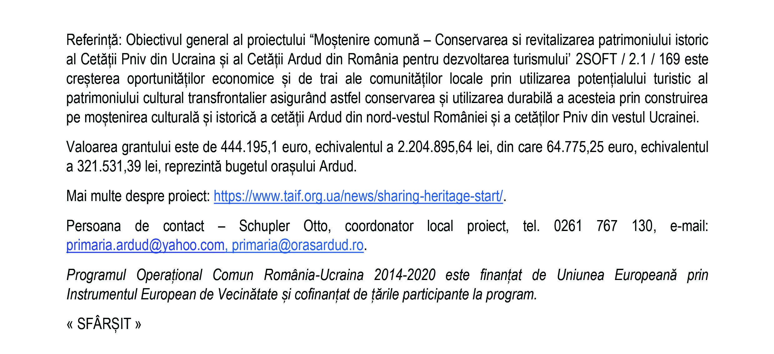 În cadrul proiectului „Sharing Heritage” va avea loc în perioada 21-23 iulie Festivalul MedievArtFest Ardud 2023 Locale • 16.07.2023 00:00 || Distribuie: Primește ziarul gratuit pe email! Abonează-te și citești ziarul Gazeta Nord-Vest zilnic, gratuit. Abonează-te Acasa Locale În cadrul proiectului „Sharing Heritage” va avea l... Articole Similare Locale Complexul de Educație Ecologică „Casa verde” din Grădina Romei, a fost gazda festivității de lansare a unui nou proiect de mediu cu titlul: GRĂDINIȚE SALVATOARE DE RÂURI acum 13 ore Locale Viceprimarul Cristina Tămășan Ilieș felicită Poliția Locală. Acțiuni intensificate împotriva cerșetoriei în Satu Mare acum 14 ore Locale Peste 10.000 de cărți electronice de identitate emise în Satu Mare. Viceprimarul Raul Băbțan: „Digitalizarea devine realitate” acum 14 ore Locale Deputatul Mircea Govor: Bugetul României a fost adoptat. Investiții importante pentru județul Satu Mare acum 14 ore Locale Cea mai mare creșă din Satu Mare, aproape de finalizare: 110 locuri pentru copii acum 14 ore Locale Deratizare în Satu Mare, în perioada 23–27 martie 2026. Avertisment pentru populație acum 14 ore Ultimele Articole Locale APASERV. Grupa Albinuțelor de la Grădinița 14 Mai a descoperit drumul apei acum 15 ore Locale Activități dedicate Zilei Mondiale a Apei. Concurs de desen, experimente și lecții despre natură pentru elevii din Medieșu Aurit acum 18 ore Locale Campania APIA 2026 – clarificări privind eliberarea adeverințelor necesare fermierilor pentru obținerea subvențiilor acum 18 ore Locale Acțiune de amploare a polițiștilor în Ardud și Beltiug: amenzi de peste 57.000 de lei și lemn confiscat acum 18 ore Locale Împreună hrănim speranța: Federația Băncilor pentru Alimente dă startul celei de-a 14-a ediții a Colectei Naționale de Alimente în Lidl, PENNY, Auchan, Kaufland și Profi acum 19 ore Locale „Maratonul poveștilor”, la Biblioteca Județeană Satu Mare, de Ziua Internațională a Cărții pentru Copii și Tineret acum 20 ore Cele mai citite 1 Complexul de Educație Ecologică „Casa verde” din Grădina Romei, a fost gazda festivității de lansare a unui nou proiect de mediu cu titlul: GRĂDINIȚE SALVATOARE DE RÂURI 2 NORD VEST TV. Slăbitul cu injecții, între speranță și risc. Avertismentul unui medic gastroenterolog din Satu Mare 3 Viceprimarul Cristina Tămășan Ilieș felicită Poliția Locală. Acțiuni intensificate împotriva cerșetoriei în Satu Mare 4 Cea mai mare creșă din Satu Mare, aproape de finalizare: 110 locuri pentru copii 5 APASERV. Grupa Albinuțelor de la Grădinița 14 Mai a descoperit drumul apei Din aceeasi categorie Complexul de Educație Ecologică „Casa verde” din Grădina Romei, a fost gazda festivității de lansare a unui nou proiect de mediu cu titlul: GRĂDINIȚE SALVATOARE DE RÂURI acum 13 ore Viceprimarul Cristina Tămășan Ilieș felicită Poliția Locală. Acțiuni intensificate împotriva cerșetoriei în Satu Mare acum 14 ore Peste 10.000 de cărți electronice de identitate emise în Satu Mare. Viceprimarul Raul Băbțan: „Digitalizarea devine realitate” acum 14 ore Deputatul Mircea Govor: Bugetul României a fost adoptat. Investiții importante pentru județul Satu Mare acum 14 ore Cea mai mare creșă din Satu Mare, aproape de finalizare: 110 locuri pentru copii acum 14 ore Ultimele stiri Complexul de Educație Ecologică „Casa verde” din Grădina Romei, a fost gazda festivității de lansare a unui nou proiect de mediu cu titlul: GRĂDINIȚE SALVATOARE DE RÂURI acum 13 ore Viceprimarul Cristina Tămășan Ilieș felicită Poliția Locală. Acțiuni intensificate împotriva cerșetoriei în Satu Mare acum 14 ore Peste 10.000 de cărți electronice de identitate emise în Satu Mare. Viceprimarul Raul Băbțan: „Digitalizarea devine realitate” acum 14 ore Deputatul Mircea Govor: Bugetul României a fost adoptat. Investiții importante pentru județul Satu Mare acum 14 ore Cea mai mare creșă din Satu Mare, aproape de finalizare: 110 locuri pentru copii acum 14 ore