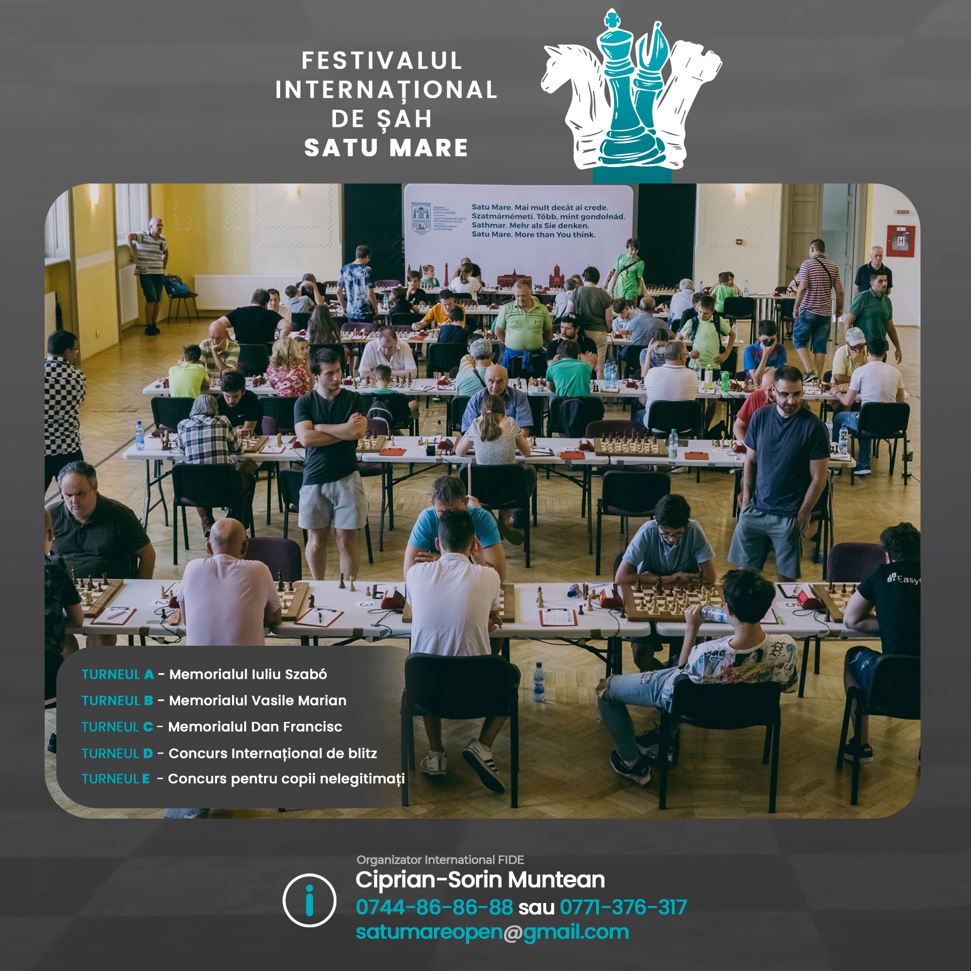 Informaţii suplimentare şi înscrieri: Organizator Internaţional FIDE Ciprian-Sorin Muntean telefon: 0744-86-86-88 sau 0771-376-317> email: satumareopen@gmail.