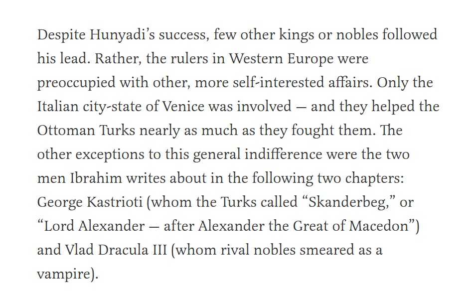Cartea are opt capitole, fiecare fiind alocat unui personaj istoric european / creștin care a luptat împotriva musulmanilor cu scopul de a apăra nu doar ținuturile părinților lor, dar și creștinismul și identitatea creștină a europenilor, printre cei opt mari eroi ai rezistenței împotriva islamului aflându-se Iancu de Hunedoara și Vlad Țepeș, dar și albanezul George Kastrioti / Skanderbeg. Ceilalți luptători sunt britanici, spanioli ori francezi care au stopat expansiunea musulmană în sudul Europei occidentale ori care au luptat în Țara Sfântă pentru eliberarea ei de sub jugul musulman. ”În ciuda succesului lui Ioan de Hunedoara împotriva turcilor, puțini alți regi sau nobili i-au urmat exemplul. Mai degrabă, conducătorii din Europa de Vest erau preocupați de alte treburi, mai interesate. Ca exemplu, putem da orașul-stat italian Veneția, care a fost implicat în a-i ajuta pe turcii otomani aproape la fel de mult pe cât au luptat.