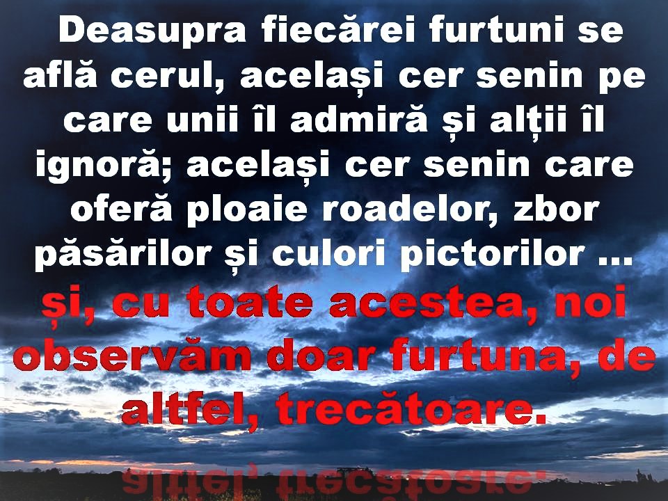 Nici lumea și nici viața nu sunt cauza propriilor noastre neajunsuri, frustrări și regrete. Totul pornește din interiorul nostru și din modul în care ne raportăm la fiecare moment al vieții noastre. Numai pentru că ochii nu privesc atent, asta nu înseamnă că nu există o altă perspectivă asupra situațiilor cu care ne confruntăm ... iar problema vine de la faptul că mintea nu vrea să accepte, dar asta nu înseamnă că nu există soluție pentru orice problemă s-ar ivi.