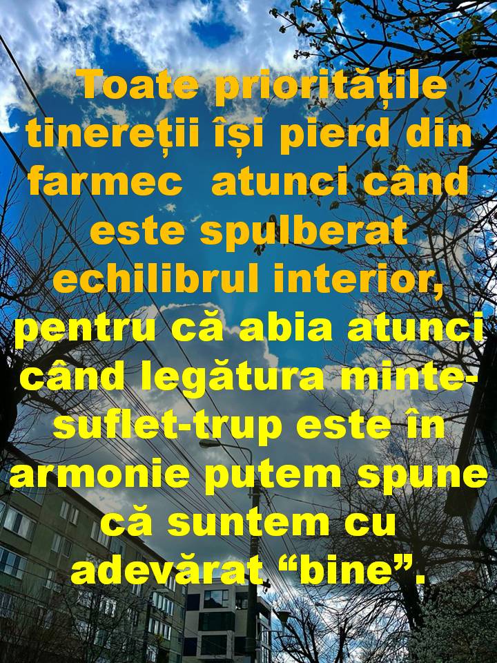 Liniștea interioară primează cu mult înaintea avuțiilor, a puterii sociale sau a vieții profesionale. Pentru că mai înainte de funcție e omul. Pentru că mai înainte de avere, e munca, stresul și sacrificiul. Pentru că înaintea puterii, e slăbiciunea. Fericirea niciodată nu vine din alte părți. Fericirea suntem noi, și tot noi hotărâm când și la ce factori declanșatori lăsăm fericirea să ne curgă prin vene. Sănătatea, bucuriile, reușitele și mulțumirea sunt cele care ne hrănesc interiorul și cele care ne aduc o fericire pe termen lung. Restul, in special lucrurile materiale, hrănesc numai orgolii și frustrări și acoperă lipsuri care niciodată nu ar trebui să copleșească un om puternic.