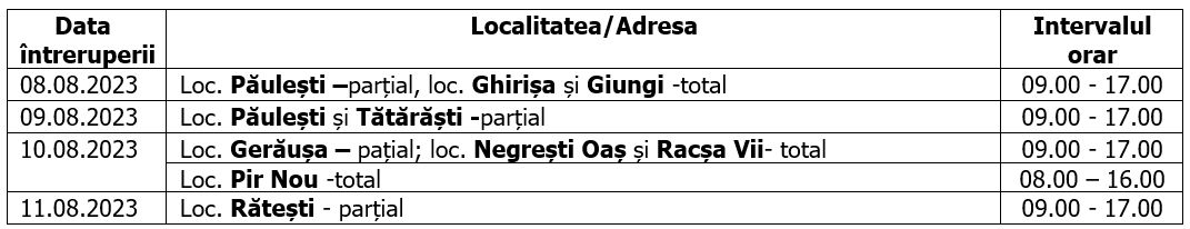 Ne cerem scuze pentru neplăcerile cauzate de aceste întreruperi, care sunt însă necesare pentru asigurarea unei bune funcţionări a instalaţiilor.