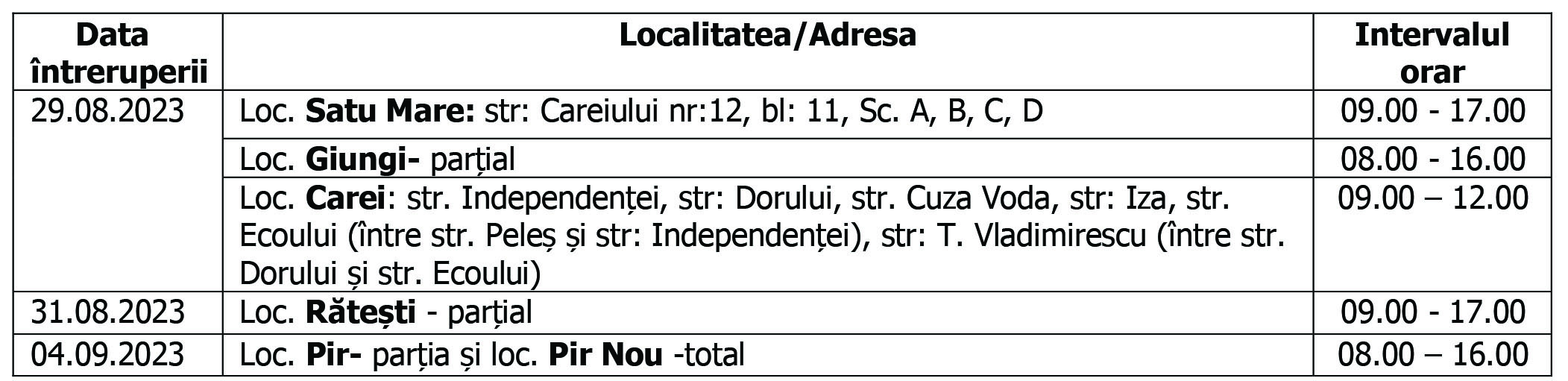 Ne cerem scuze pentru neplăcerile cauzate de aceste întreruperi, care sunt însă necesare pentru asigurarea unei bune funcţionări a instalaţiilor.