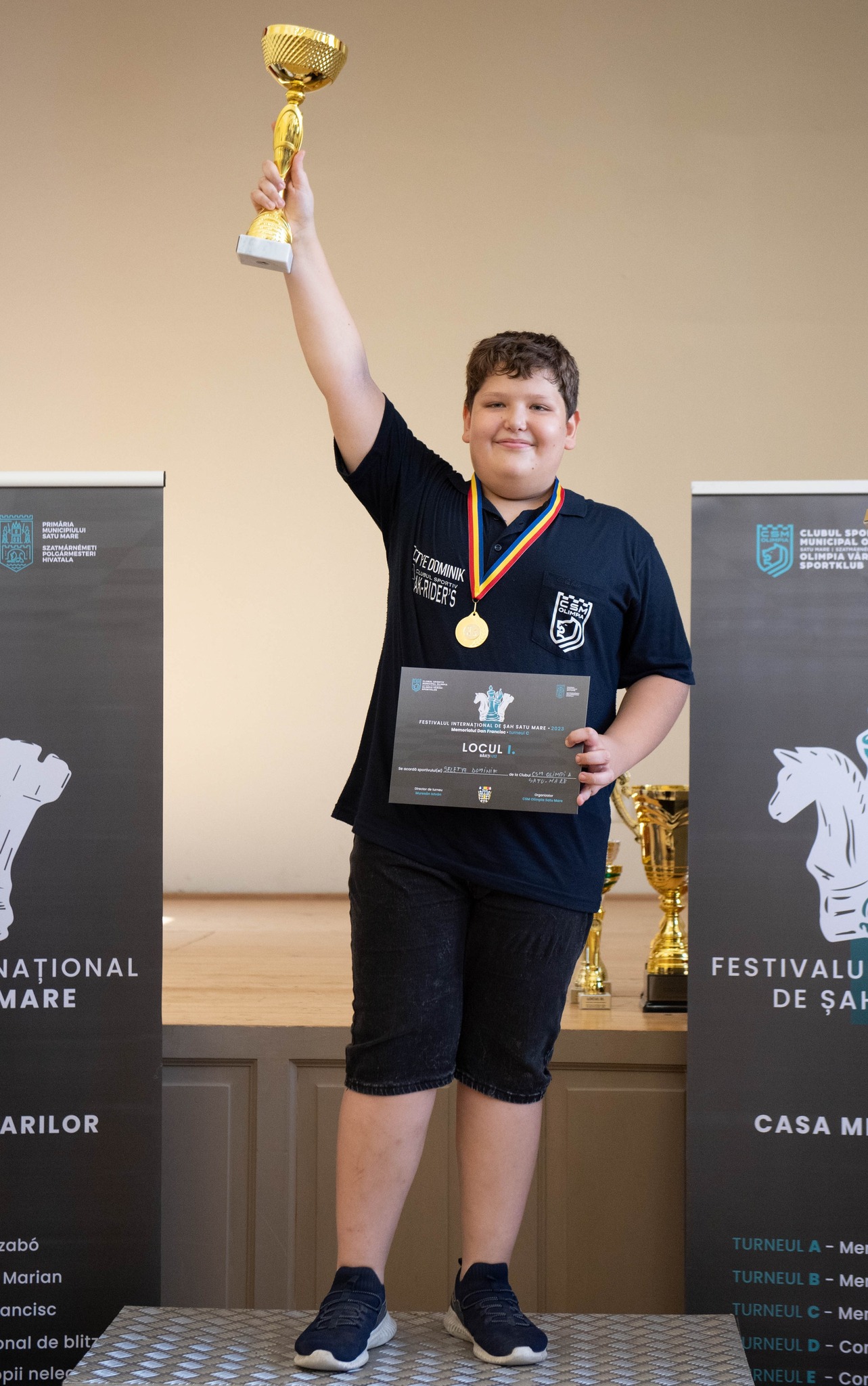 ” După 4 zile de “foc” (la propriu si la figurat) azi, s-a incheiat cel mai mare festival de șah din nord-vestul României care a avut loc la Casa Meșteșugarilor din Satu Mare, unde au participat peste 140 de sportivi din 6 țări. Un nou concurs greu, din cele 7 runde Dominik a jucat cu 1 singur jucător cu ELO mai slab cotat, ceilalți 6 jucători aveau ELO mult peste ELO-ul lui Dominik.