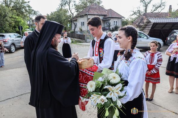 La final, părintele paroh a mulțumit Preasfințitului Părinte Timotei Sătmăreanul pentru prezență și slujire, și, în semn de recunoștință și prețuire a oferit ierarhului o icoană cu hramul bisericii - Adormirea Maicii Domnului - și un coș cu flori.
