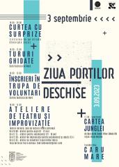 Pentru o zi, curtea teatrului (intrarea de pe strada Gheorghe Doja) devine Curtea cu Surprize care mai de care, pe care sunteți invitați să le descoperiți. Prima e din partea casei: Trupa de Voluntari recrutează membri noi! Oricine e interesat e rugat să se ia după tricourile inconfundabile ale voluntarilor, să-i oprească în drum și să ceară mai multe detalii. Garantăm o duminică veselă și colorată la Teatru, care se va încheia cu musicalul „Cartea Junglei", adaptare după Rudyard Kipling, regia Nagy Regina, care va începe la ora 17. Prețul biletelor pentru spectacol este de 20 lei pentru copii și pensionari, 30 de lei pentru adulți, iar intrarea va fi gratuită pentru toți cei care își achiziționează un abonament pentru stagiunea 2023 – 2024.