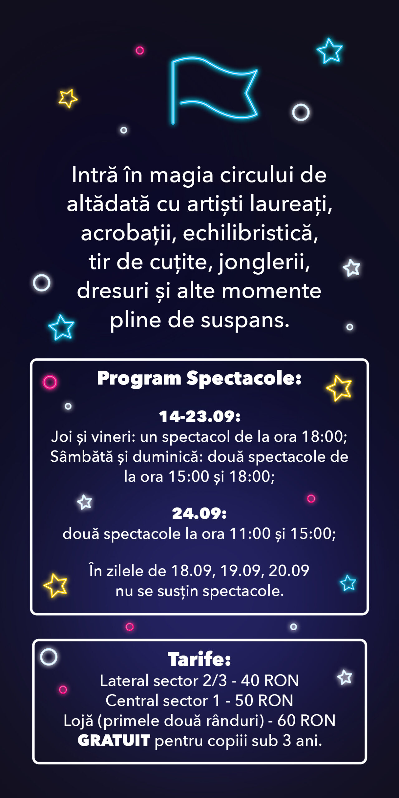 Copiii și adulții deopotrivă sunt invitați să exploreze spectaculoasa lume a circului și să se bucure de o experiență memorabilă. Spectacolele includ acte de jonglerii, echilibristică, acrobații și multe alte momente ce vor ține audiența cu sufletul la gură.