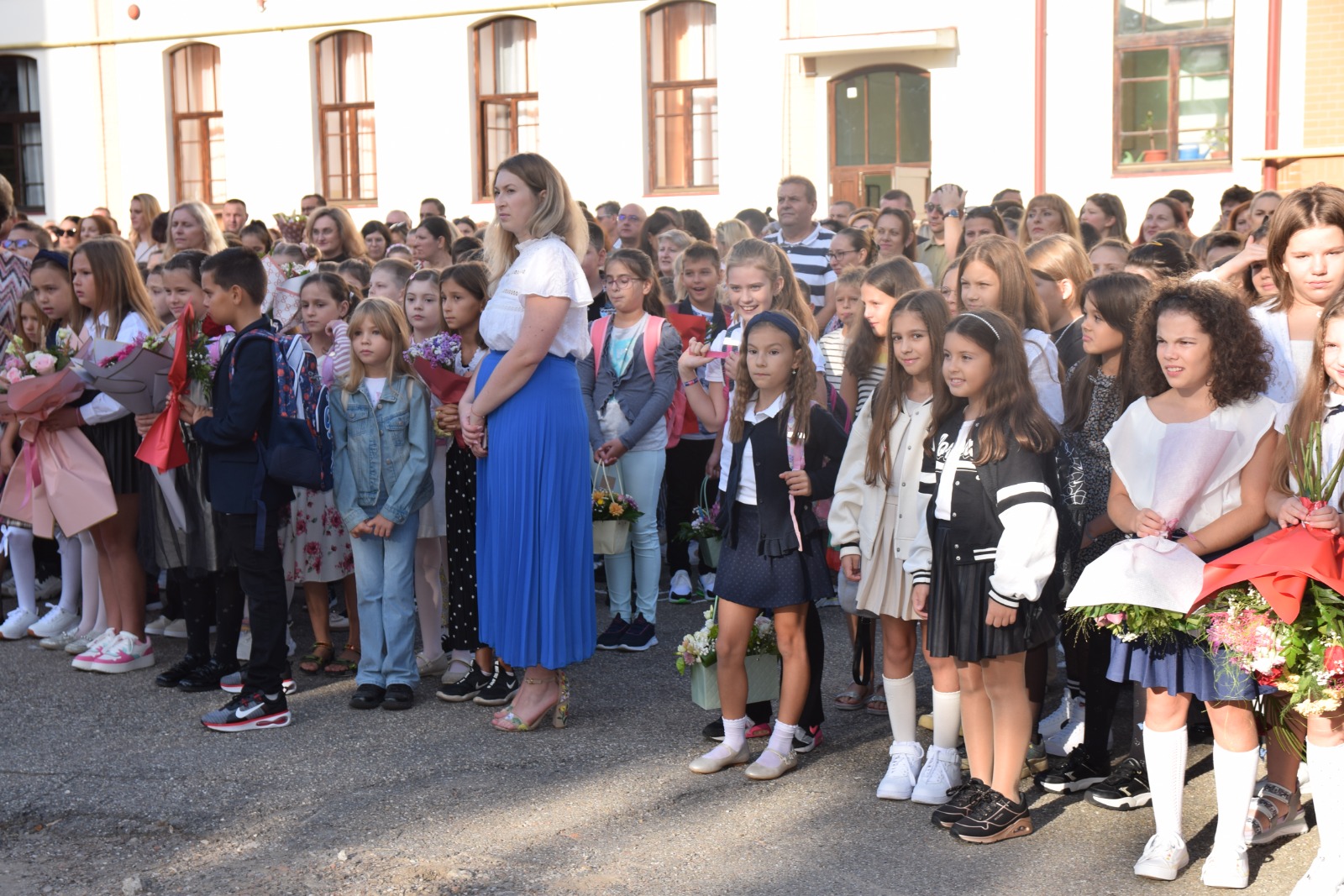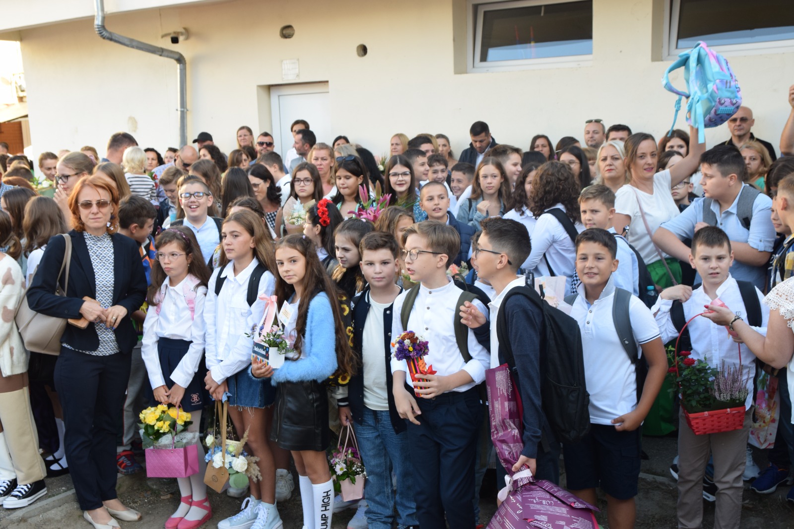 Flori, baloane și multe emoții de bună dimineața în curtea Școlii Gimnaziale ”Grigore Moisil” ( fostă generală 1) din Satu Mare.