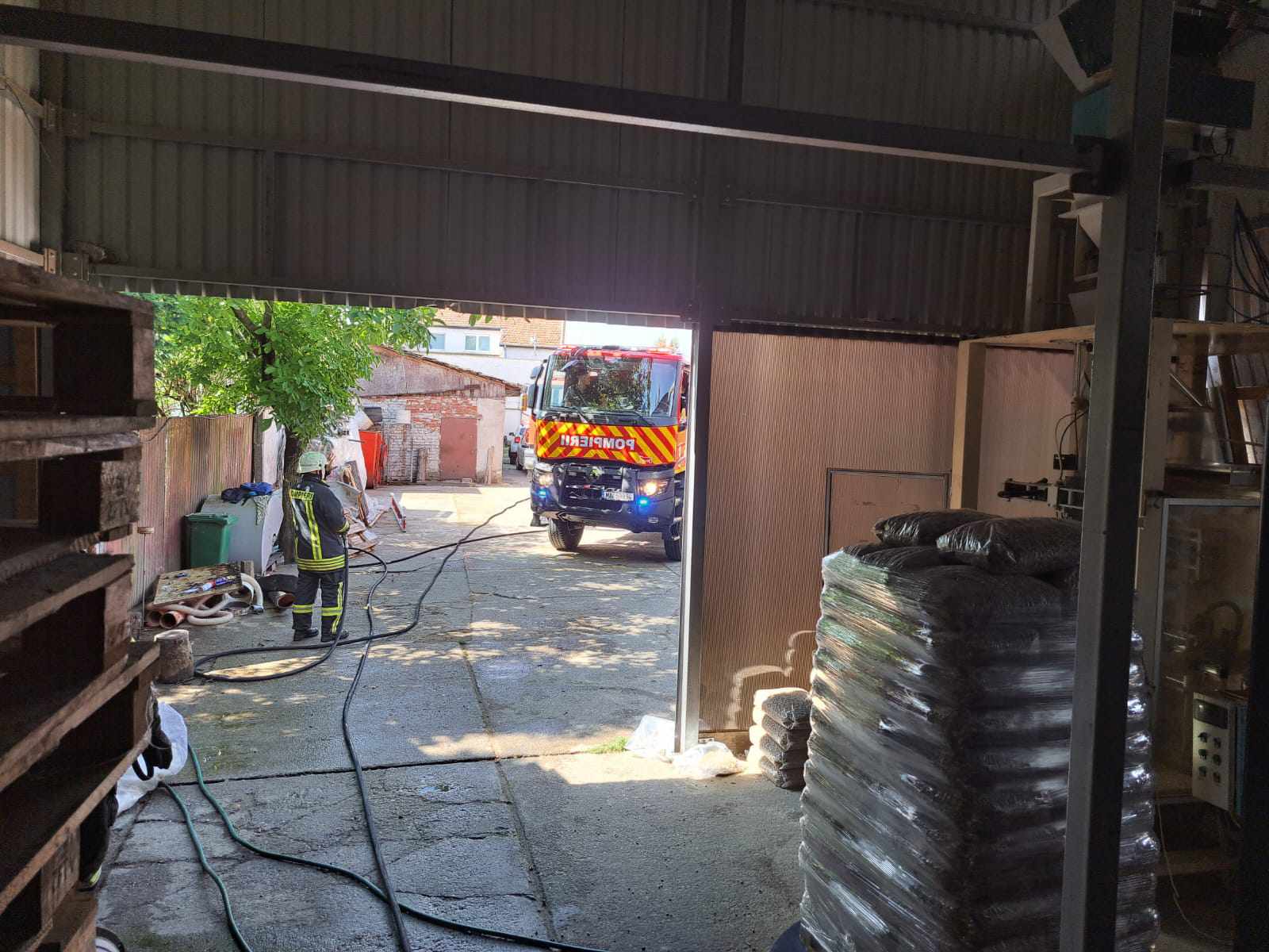 În jurul orei 12:00, prin apel la numărul unic de urgență 112, a fost solicitat ajutorul pompierilor militari pentru stingerea unui incendiu izbucnit la o hală de producție peleți, situată la intrarea în localitatea Lazuri.