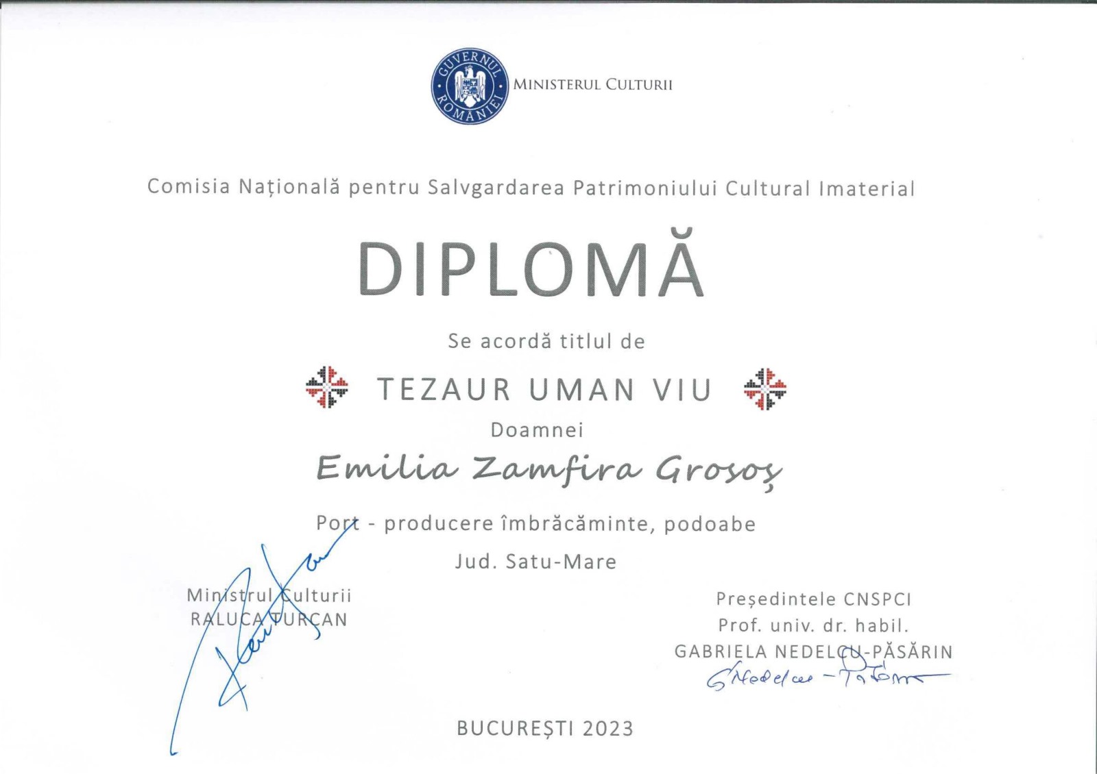 Ministerul Culturii, prin Comisia Națională pentru Salvgardarea Patrimoniului Cultural Imaterial, acordă titlul onorific de TEZAUR UMAN VIU, iar anul acesta din cele 47 de dosare de candidatură depuse la nivel național, printre cele 12 persoane selectate purtătoare, creatoare și păstrătoare de patrimoniu cultural imaterial, se află și sătmăreanca Emilia Zamfira Grosoș.