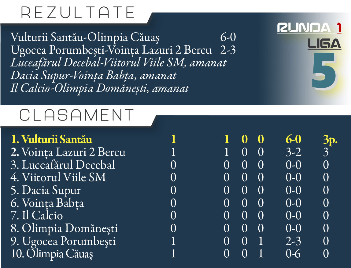 Victorie solidă pentru "vulturii" din Santău, 6-0, împotriva Olimpiei Căuaş. La pauză s-a intrat cu avantaj 2-0, marcatori: Pop Cristian ('30) şi Contraş ('35). În repriza a doua au mai punctat Madas ('56) ('81 p.), Contras ('78) şi Pop Cristian ('89).