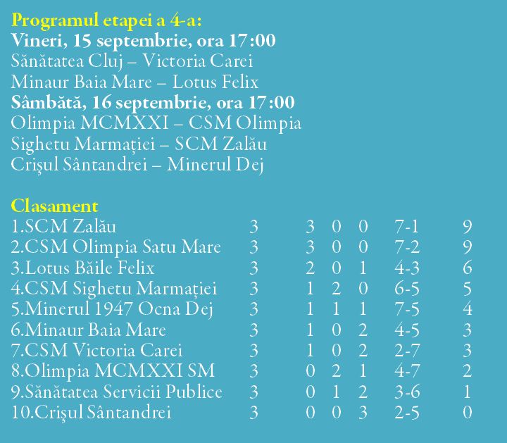 Elevii lui Marius Botan joacă vineri de la ora 17 la Cluj cu Sănătatea, o echipă ce nu a obținut decât un singur punct în primele trei runde, 2-2, la FC Olimpia 1921 Satu Mare în etapa de debut.