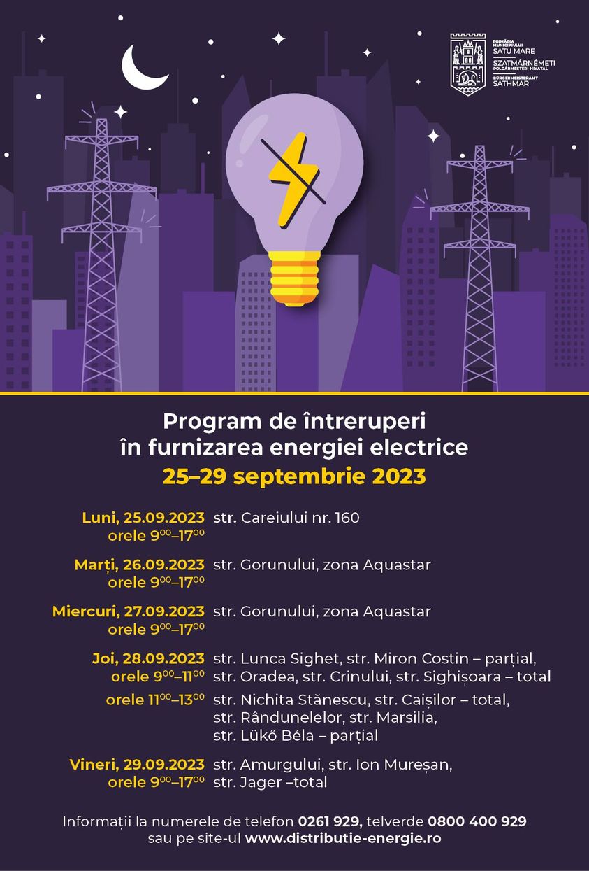 Sucursala de Distribuție a Energiei Electrice Satu Mare anunţă întreruperea alimentării cu energie electrică în municipiul Satu Mare între datele 25-29 septembrie 2023.