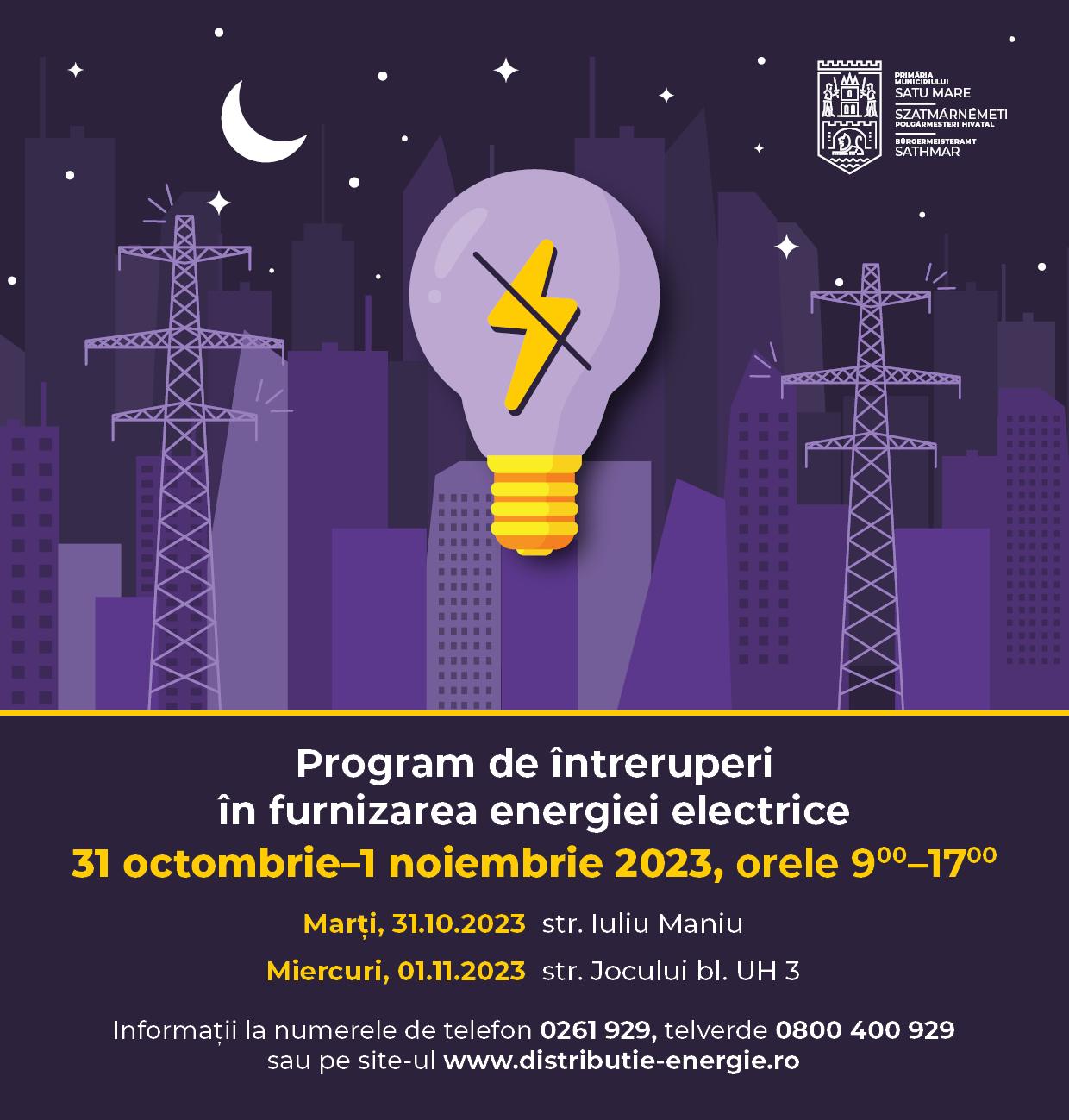 Sucursala de Distribuție a Energiei Electrice Satu Mare anunţă întreruperea alimentării cu energie electrică în municipiul Satu Mare.