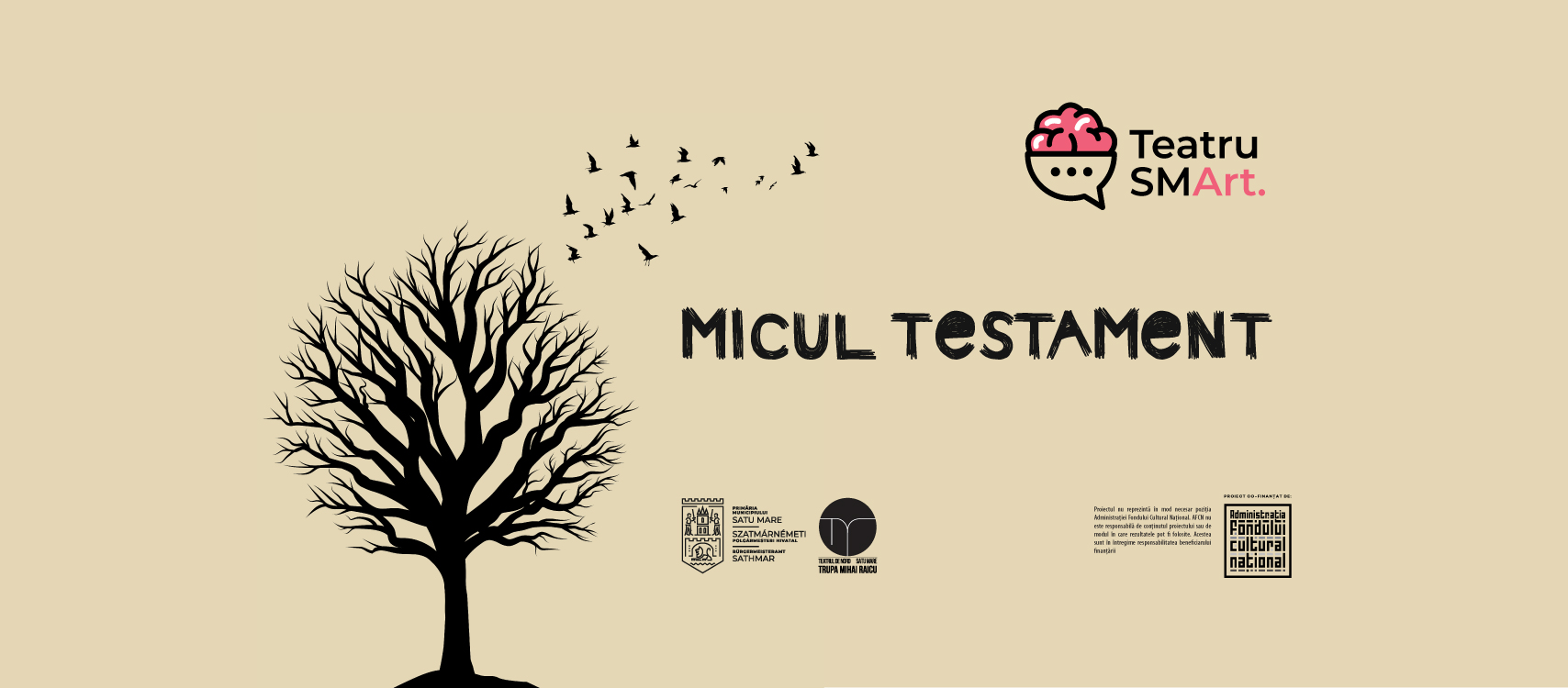Proiectul Teatru SMArt este cofinanțat de AFCN. Proiectul nu reprezintă în mod necesar poziția Administrației Fondului Cultural Național. AFCN nu este responsabilă de conținutul proiectului sau de modul în care rezultatele pot fi folosite. Acestea sunt în întregime responsabilitatea beneficiarului finanțării.