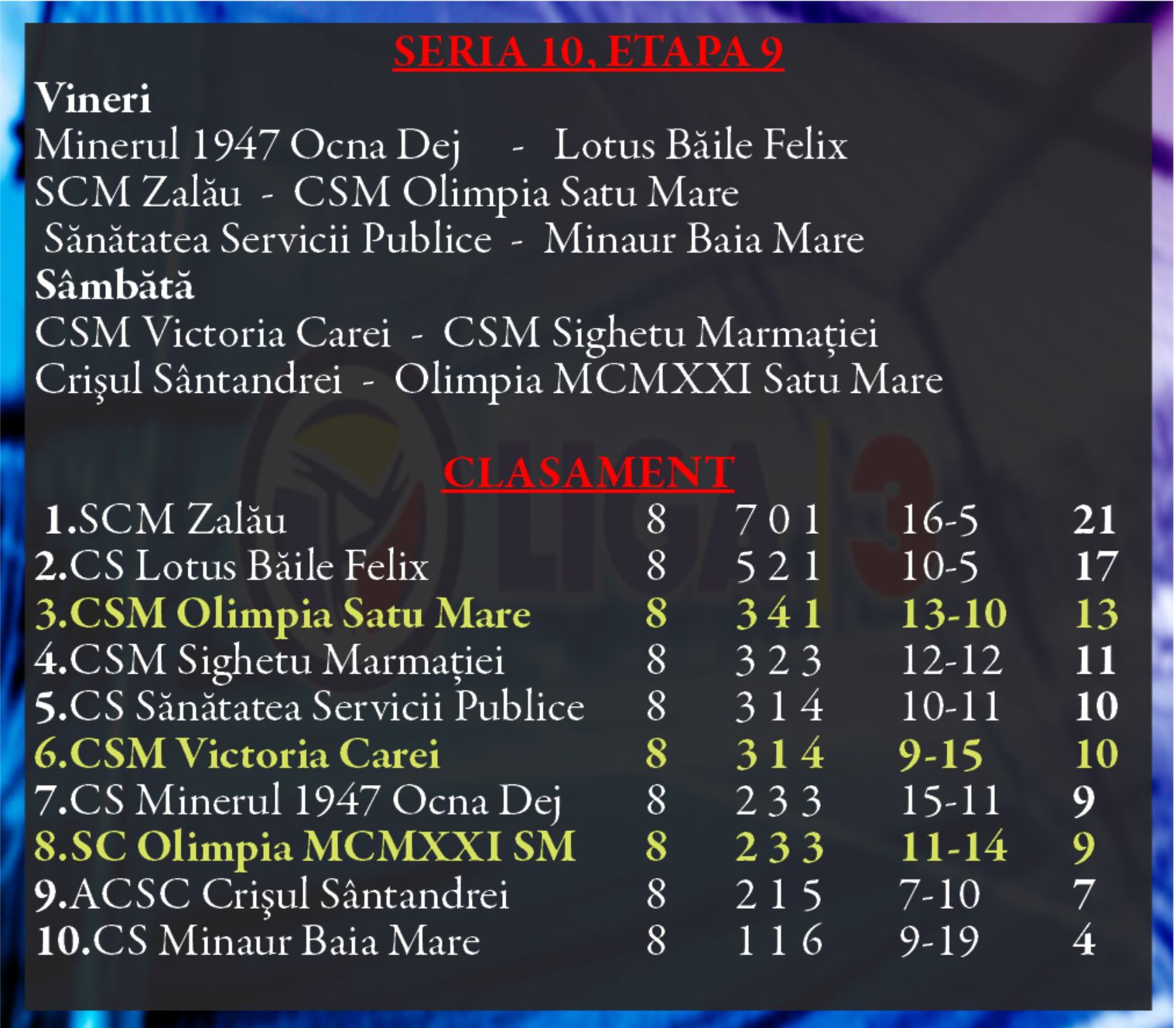 Turul Ligii a 3-a se încheie la acest sfârșit de săptămână iar în seria a 10-a avem vineri derby-ul SCM Zalău- CSM Olimpia Satu Mare.