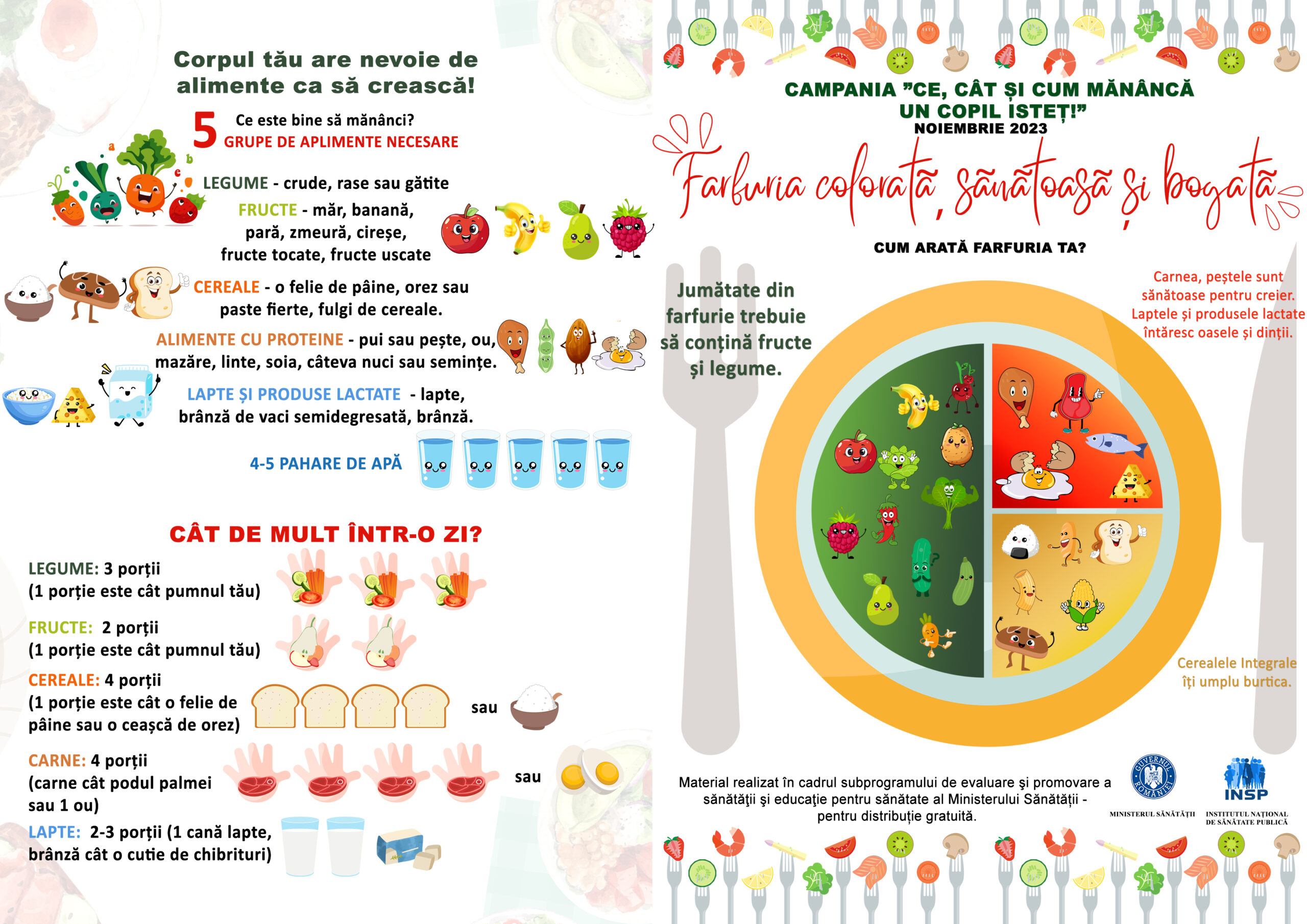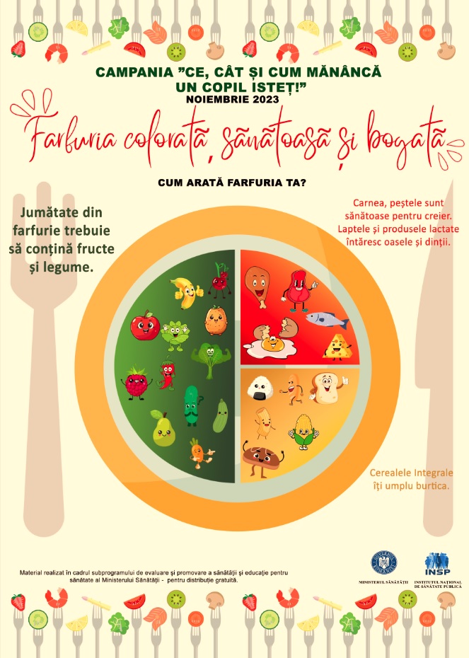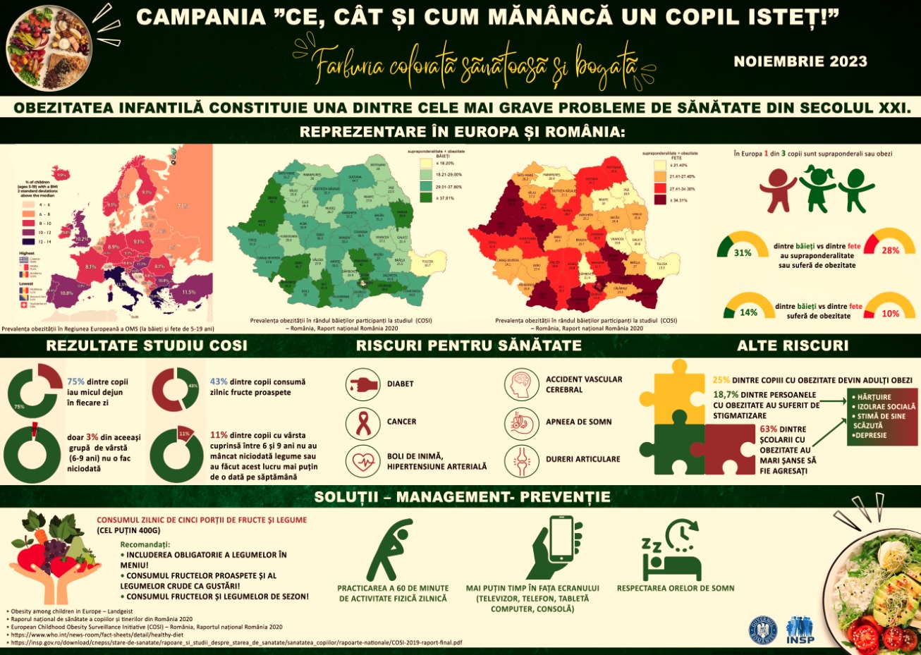 Ministerul Sănătății, cu sprijinul Institutului Național de Sănătate Publică și al direcțiilor de sănătate publică, a desfășurat pe parcursul lunii noiembrie campania „Ce, cât și cum mănâncă un copil isteţ”, campanie care s-a adresat copiilor din ciclul primar de învățământ, părinților acestora și cadrelor didactice, urmărind informarea şi educarea privind principiile unei alimentații sănătoase la vârsta școlară. De asemenea, campania a vizat creșterea conștientizării problematicii obezității infantile și informarea părinților despre beneficiile unei alimentații sănătoase care să prevină obezitatea în rândul copiilor și complicațiile acesteia pentru viitorii adulți.